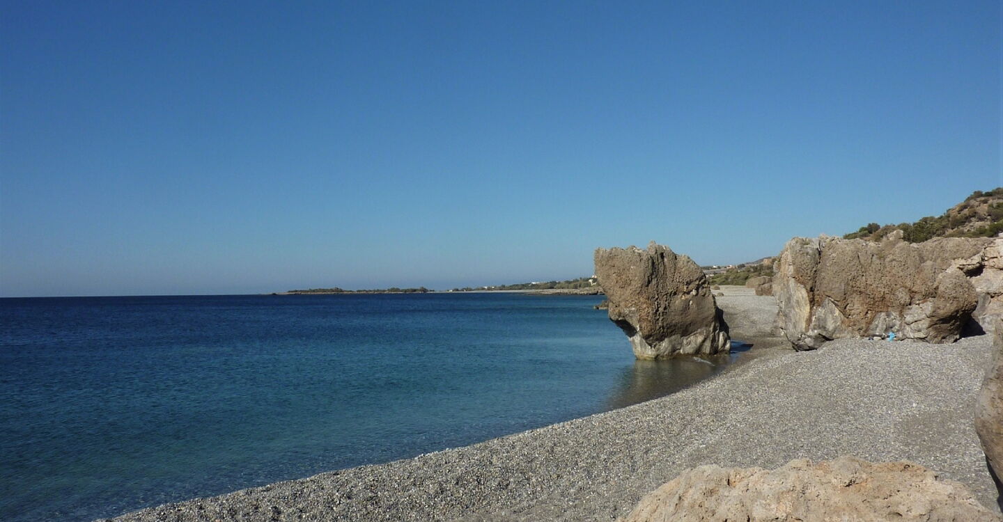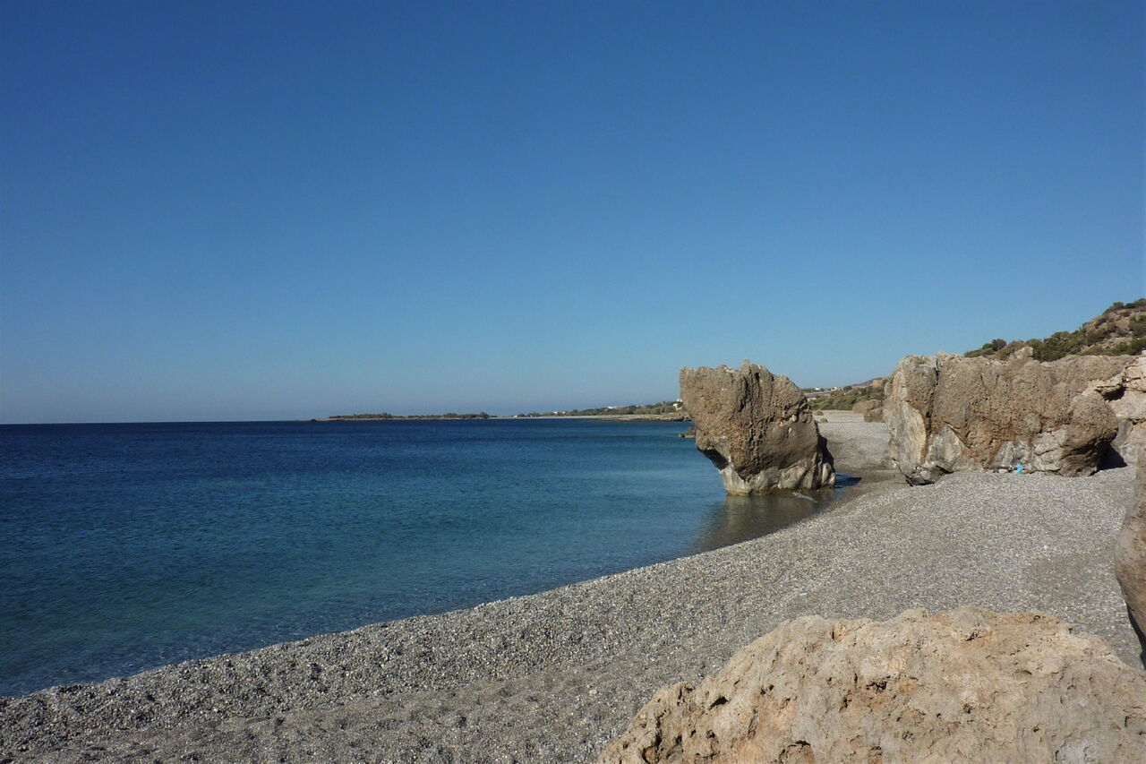 Kurz hinter einem Strandabschnitt gehen wir dann aber zwangsläufig auf der Straße und erreichen den 02 Karavopetra-Strand (5 m), was so viel heißt wie das Steinboot, benannt nach dem der Bucht vorgelagerten großen Stein, der wie ein Boot aussieht. Nach weiteren 1,4 km, bei einer Norfolktanne, biegen wir links in die Schotterpiste ein und setzen den Weg am Strand fort. Nach 300 m queren wir die Landzunge von Trachili (der Hals). Im Westen geht unser Weg über den besonders schönen Strand Grammeno Votsalo weiter. Auf der Straße geht es anschließend vorbei an dem Dorf Gialos, den Iris Studios und einem kleinen Hafenbecken, bis die Straße endet. Hier gehen wir links Richtung Aghia Kyriaki, verlassen aber nach 200 m in der Linkskehre die Asphaltstraße auf die halb links weiterführende Piste. Nachdem wir 450 m parallel zu Gewächshäusern gewandert sind, gehen wir auf einem schmalen Schotterweg zum Meer hinunter und nun fortan am Strand entlang.