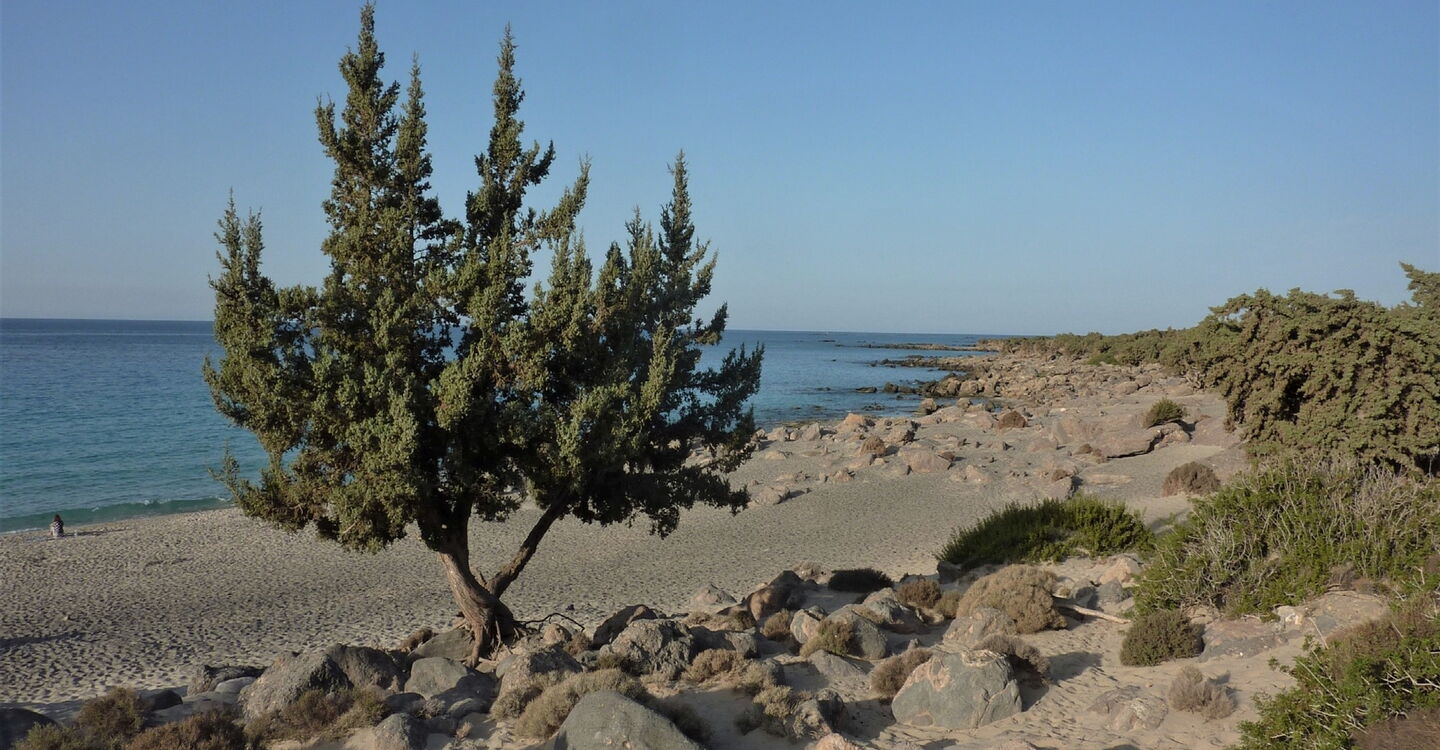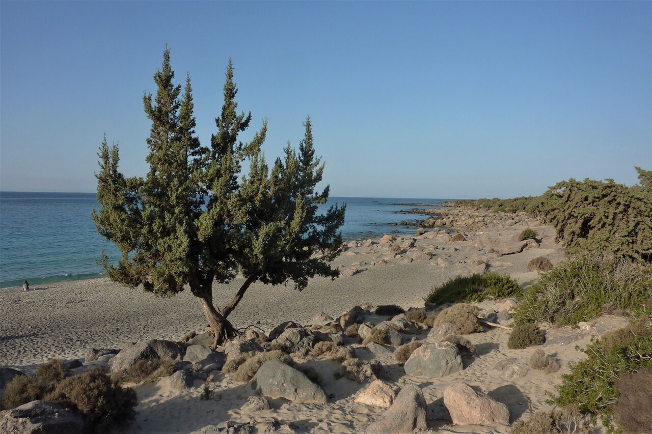 Wir gehen zunächst 70 m auf dem Uferpfad zurück, um dann scharf links auf einem gut auszumachenden Pfad aufzusteigen. Bei der nachfolgenden Anhöhe werden wir mit einem faszinierenden Fernblick auf die Halbinsel Elafonisi belohnt. Immer auf gleichem Höhenniveau queren wir den Hang und erreichen die auf einem Hügel stehende Kapelle Agios Ioannis. Nun kontinuierlich bergab erreichen wir einen weiteren wunderschönen Strandabschnitt. Der Weg steigt wieder an und wir queren eine kleine Schlucht. Obacht! Hier gehen wir nicht geradeaus weiter, sondern links oberhalb der Schlucht 140 m bergab, um dann rechts über Felsen den wildromantischen 04 Kedrodasos-Strand (1 m) zu erreichen. Sanddünen aus nahezu weißem Sand und uralte Zedern verzaubern den Betrachter.