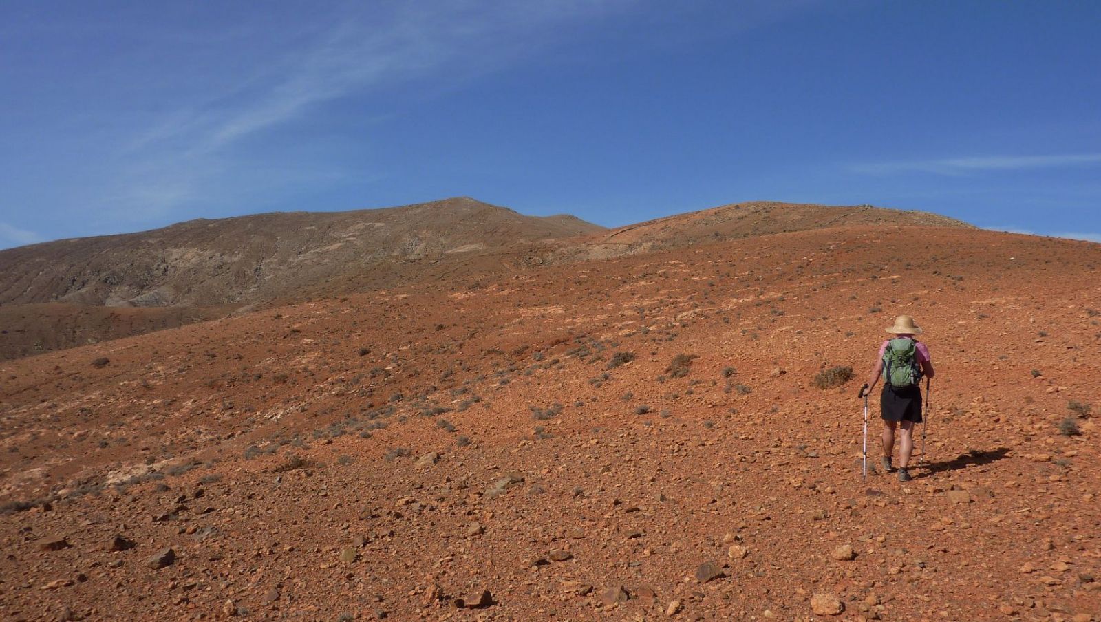 Auf dem mäßig ansteigenden Bergrücken erreichen wir auf leicht gerölligem Untergrund den (04) Pico de Betancuria (724 m). Wir haben es geschafft und genießen den imposanten 360°-Rundblick. Am Gipfel treffen drei Grundstückbegrenzungsmauern zusammen, hinter denen man bei einem stark wehenden Passatwind Schutz findet.