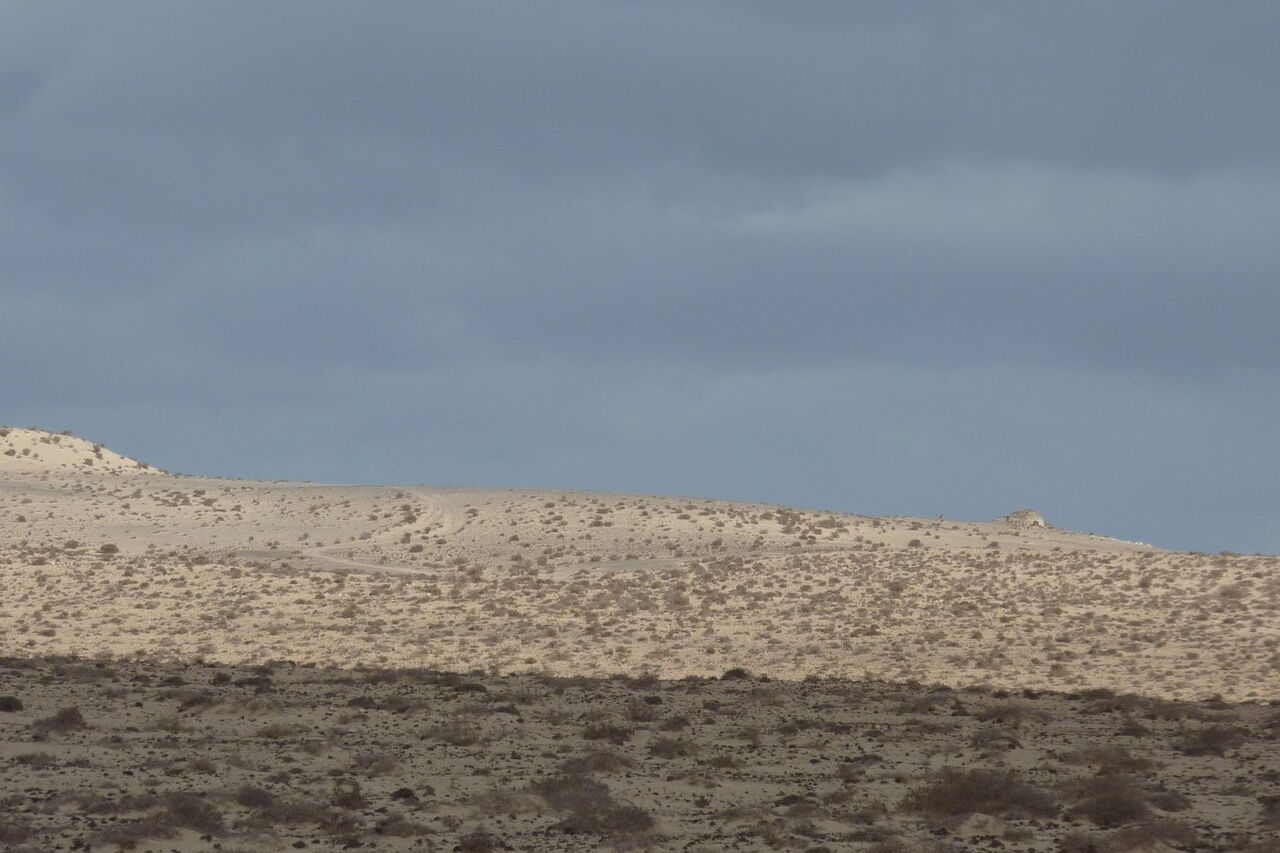 Wir starten die Wanderung in westlicher Richtung und gehen im 90°-Winkel zur Asphaltstraße, die auf den Hügel führt. Zuerst übersteigen wir weglos den vor uns liegenden Sandhügel. Schon bald können wir in der Ferne die Nordwestküste erblicken, die nach ca. 2,5 km Fußmarsch erreicht wird. Auf der Wanderung queren wir zahlreiche Pfade, die wir alle ignorieren. Da keine weiteren markanten Wegpunkte vorhanden sind, ist die Navigation nicht einfach. Wir steigen auf das untere Plateau direkt oberhalb des Meeresspiegels ab und gehen von dort aus links an der Küste entlang.