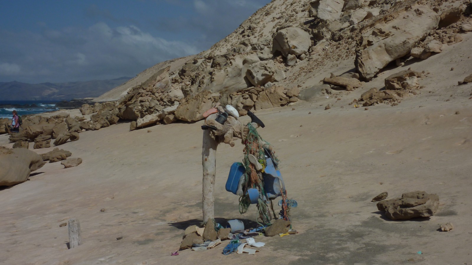 Mitunter kann hier auch kreativ gesammelter Müll betrachtet werden. Nach einiger Zeit kommen wir an die kleine, einsame Bucht. Je nach Wellengang und Stand der Gezeiten präsentiert sich ein sehr schöner Strandabschnitt, der zum Verweilen einlädt.