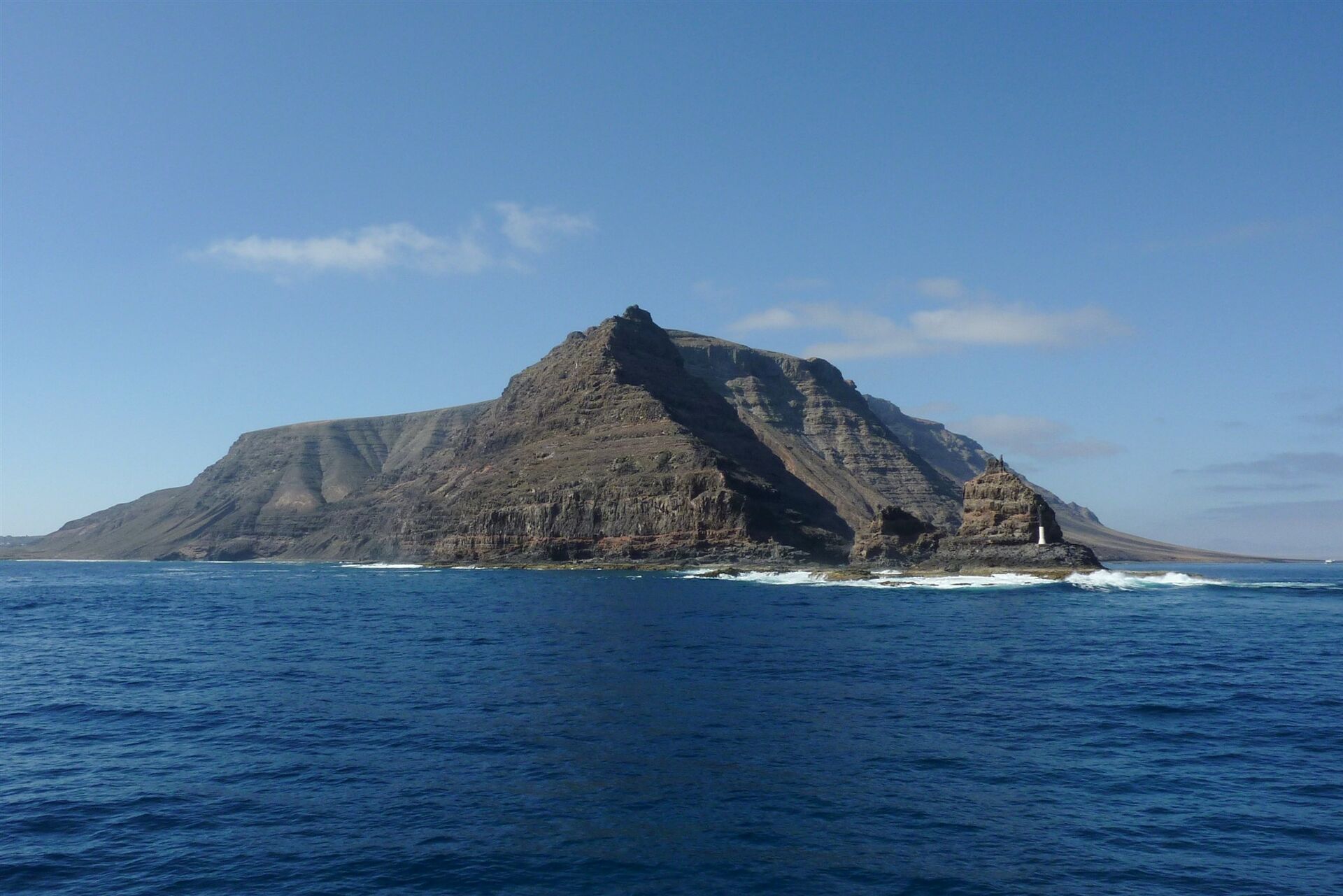 Es folgt ein landschaftlich sehr schöner Weg. Auf der rechten Seite sieht man die Nordspitze von Lanzarote mit den steil abfallenden Klippen des Famara Gebirgsmassivs. Links auf La Graciosa sind die 04 beiden Vulkane 3 m Agujas Grandes (267 m) und Agujas Chicas (257 m) zu sehen.