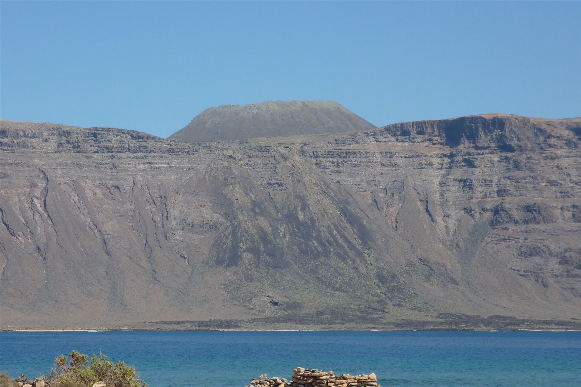 Kurz dahinter beginnt eine Sandpiste, der wir 1,2 km parallel zur Küste folgen. Bei Ebbe kann man auch direkt am Strand entlang laufen, bis man die Lagune Bahia del Salado mit ihrem gleichnamigen Strand 02 Playa del Salado 1m erreicht. Je nach Gezeitenstand kann man quer durch die Lagune gehen oder auf der Sandpiste um sie herum. Schaut man von hier aus in Richtung Lanzarote, so ergibt sich ein tolles Fotomotiv mit der vorgelagerten Lagune, der Meeresenge El Rio, dem Famara Gebirgsmassiv und im Hintergrund dem Vulkan Monte Corona.