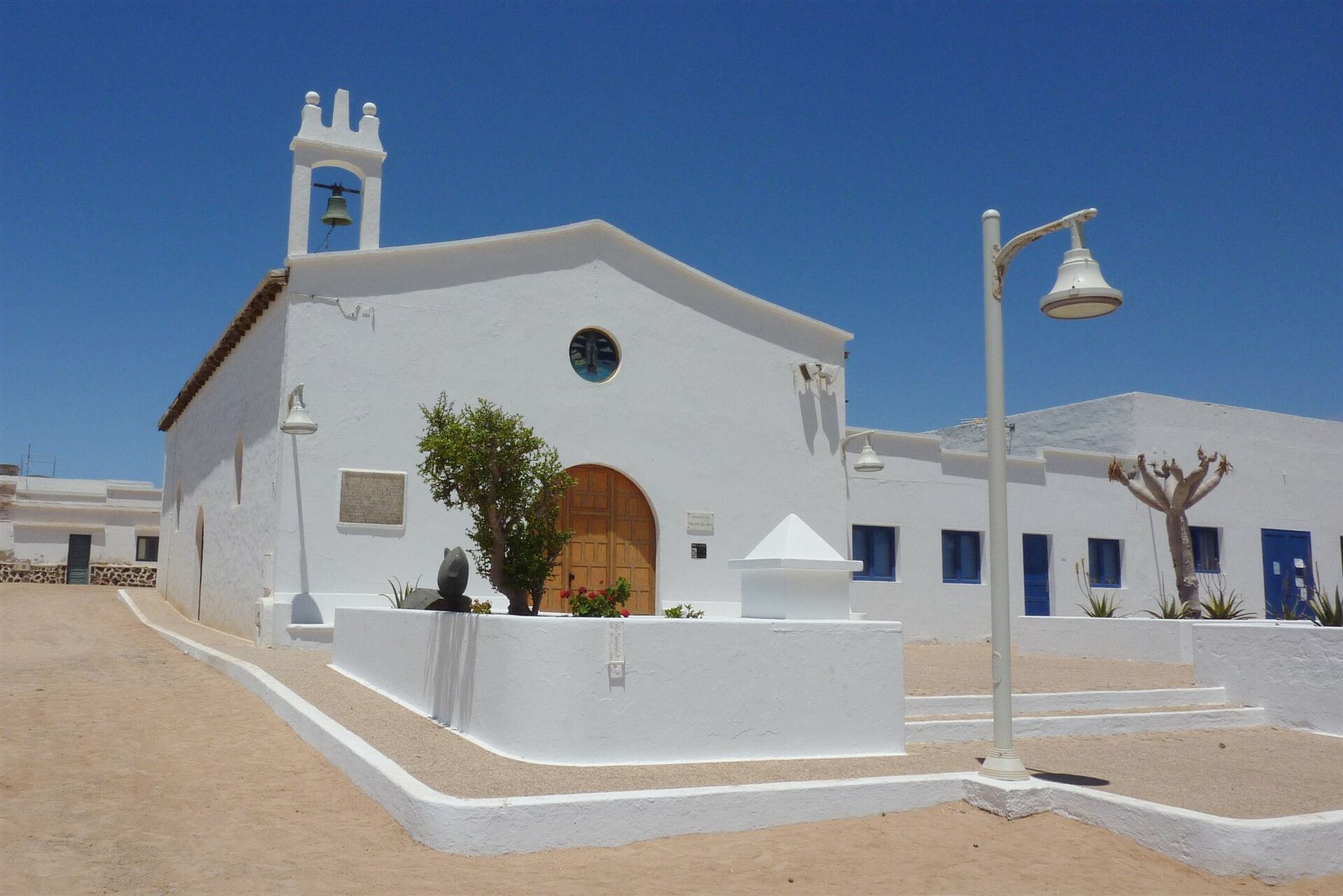 Bei der folgenden Weggabelung führt der Weg rechts an dem mittig stehenden Haus vorbei. Wir gehen direkt auf die schlicht gehaltene weiße Dorfkirche 02 La Virgen del Mar 3 m mit ihrem minimalistischen Glockenturm zu. Im Inneren der Kirche gibt es eine Besonderheit, ein Taufbecken aus einem Schildkrötenpanzer. Weiter führt unser Weg rechts vorbei an der Kirche, um dann gleich links in die nächste Sandpiste abzubiegen. Hinter dem Kinderspielplatz gehen wir rechts, bevor wir dann gleich wieder links in die nächste Straße abbiegen. An einer Wegkreuzung gehen wir halb links auf den mit vereinzelten Sandhaufen gesperrten Weg, bis wir auf den Hauptweg treffen, auf dem der Richtung Norden weiter wandern.