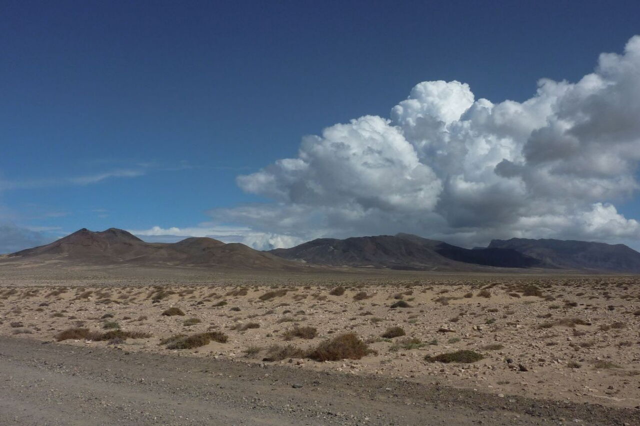 Vom (01) Start und Ziel (18,4 m) oberhalb des Playa de Ojos wandern wir im rechten Winkel zur Schotterpiste – also in östliche Richtung – weglos in Richtung der Ausläufer des halb links vor uns liegenden und zugleich südlichsten Vulkans von Fuerteventura – Montana Las Talahijas. Über der kargen Ebene weht meistens ein starker Nordostpassat. Wir treffen auf eine Schotterpiste, die wir nach nur 200 m wieder verlassen, um nun um den Vulkan herumzulaufen und so in eine Ebene zwischen zwei Vulkanen zu gelangen.