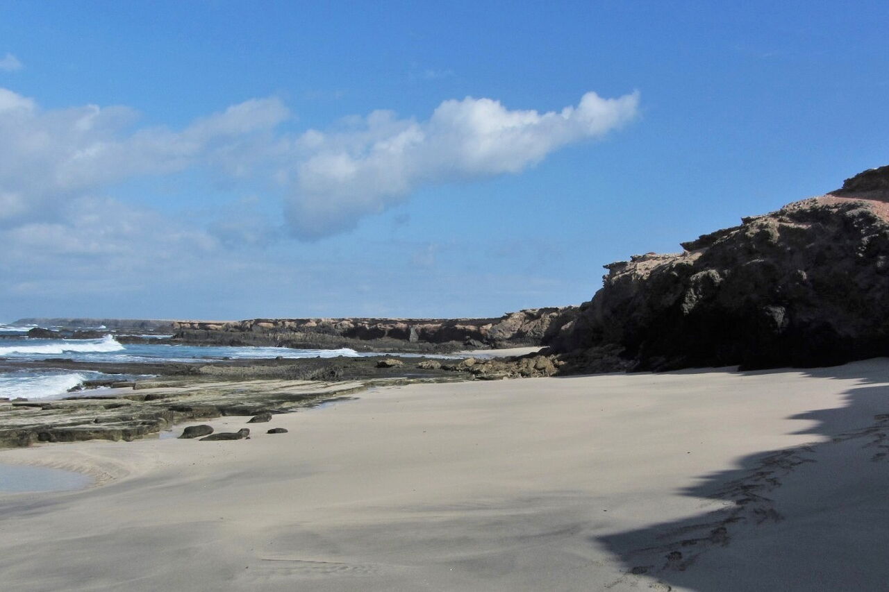 Der sehr wenig besuchte, 250 m lange und bis zu 10 m breite feine Sandstrand liegt versteckt im äußersten Südwesten von Fuerteventura, in der Nähe des Örtchens Puerto de la Cruz. ǀ Der Strand ist nach einer schwierigen Autofahrt auf einer kurzen Wanderung zu erreichen. ǀ Baden ist aufgrund der hohen Wellen nur bedingt möglich. ǀ Verschiedenes: sehr romantischer, sauberer Strand mit sauberem Wasser, teilweise Schatten, nicht mit dem Buggy erreichbar, FKK möglich, Hunde nicht erlaubt ǀ Toiletten, Duschen, Sonnenstühle und Sonnenschirme sind nicht vorhanden ǀ Aktivitäten: die Seele baumeln lassen, Boccia ǀ Tipp: Bei starken Winden, die es auf Fuerteventura oft gibt, liegt man am Playa de Ojas unterhalb der Felsen sehr windgeschützt! |