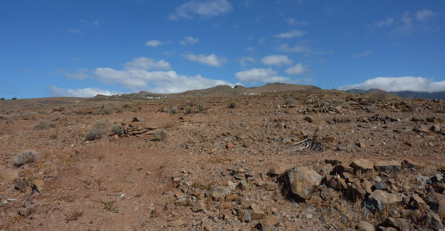 Hier biegen wir links ab, Richtung Valle Gran Ray, um nach 120 m von der (02) GM-3 (77 m) scharf nach rechts abzubiegen. Schon bald geht die Asphaltstraße in eine Schotterpiste über und von nun an gehen wir auf einem zunehmend breiter werdenden Bergrücken in Richtung der Roques de los Moros und Redondo, die in der Ferne gut auszumachen sind. Hinter einer Ruine ergeben sich rechts atemberaubende Blicke in das 300 m tiefer liegende Barranco der Santiago. Auch ist im zentralen Hochgebirge der Vulkanschlot Roque de Agando sehr gut auszumachen. Wir erreichen einen Abschnitt mit vielen Terrassenfeldern und gehen Richtung Westen, bis wir auf einen Abzweiger nach links treffen - dort steht ein einzelner Betonpfeiler. Diesen Abzweiger ignorieren wir jedoch und bleiben auf dem Hauptweg.