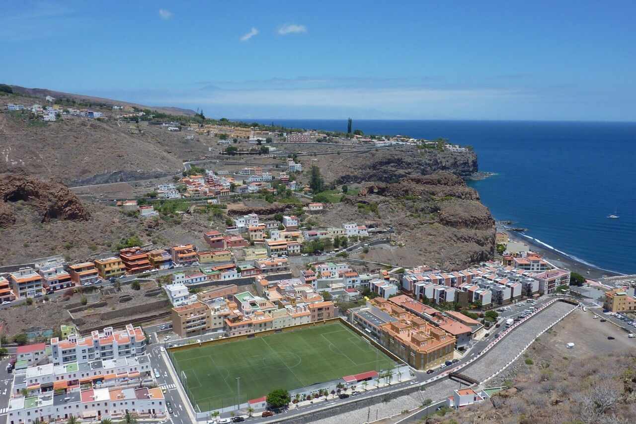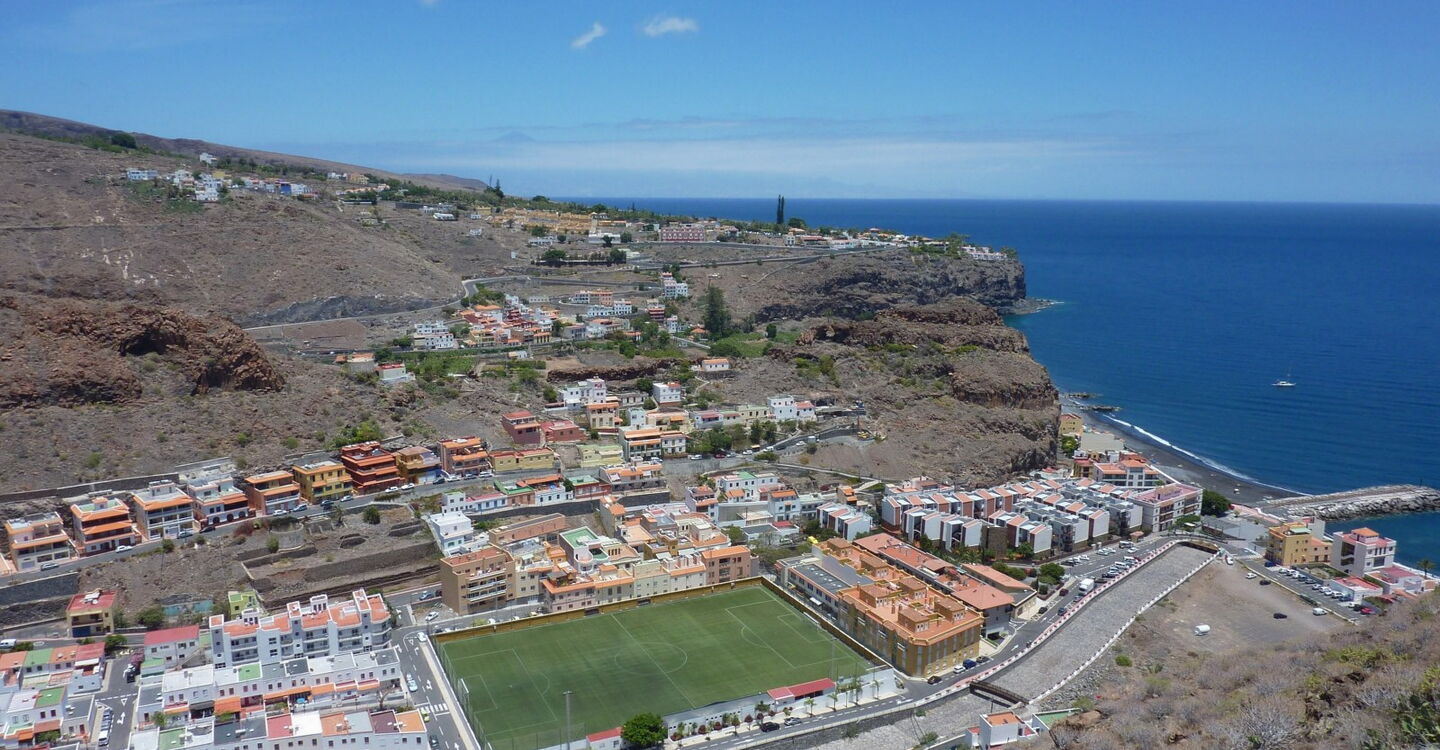 Bei vereinzelten Häusern erreichen wir erneut eine Asphaltstraße, die oberhalb eines weiteren Staudamms verläuft. In der folgenden Rechtskurve der Straße gehen wir halb links auf den beginnenden Camino, Richtung Playa de Santiago. Wir gehen ein kurzes Stück auf der GM-3, bis wir auf Höhe der Start- und Landebahn sind, um hier links vor einem grünen Maschendrahtzaun auf einen Camino zu wechseln und auf diesem bis zum (05) Mirador de La Trinchera (150 m) zu wandern. Es folgt der finale Abstieg zum Ausgangspunkt.