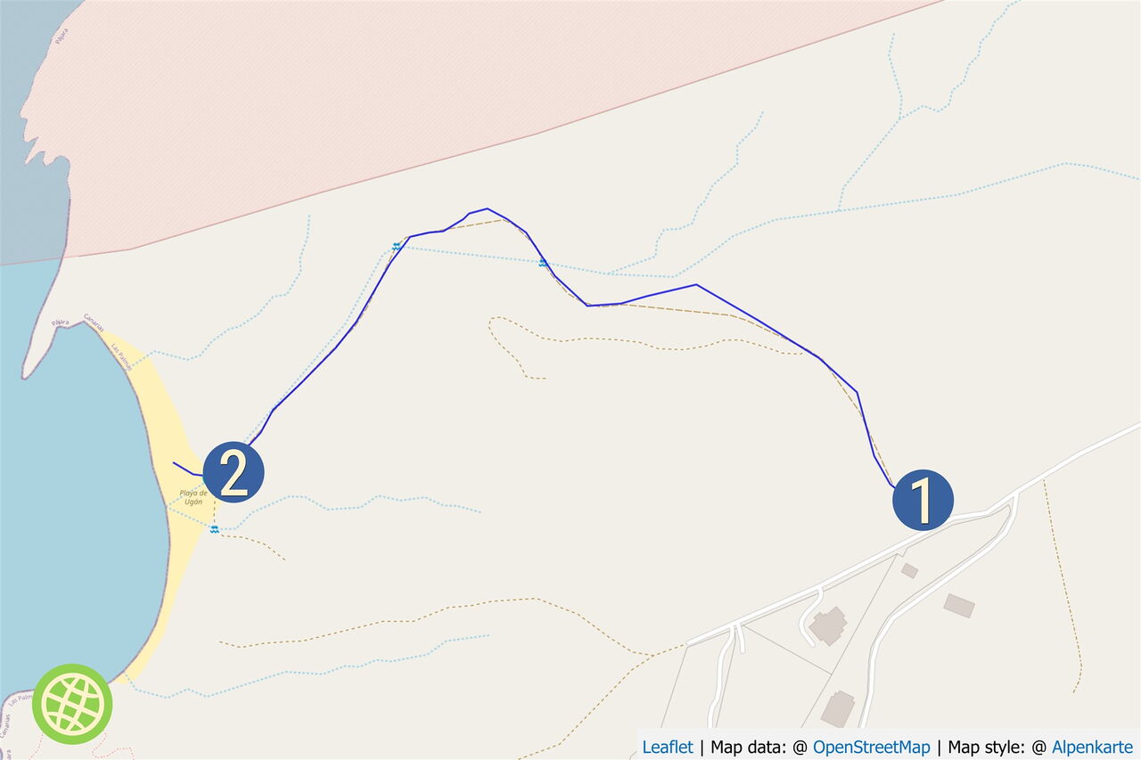 Wenn wir uns entschieden haben, das Auto in der Nähe der hohen Grundstücksmauer zu parken, steigen wir rechts in das Barranco hinab. Dort angekommen, führt der Weg links durch vereinzelte Kiefern direkt bis an den Strand. Nach ausgiebiger Pause gehen wir den gleichen Weg zum Ausgangspunkt zurück.