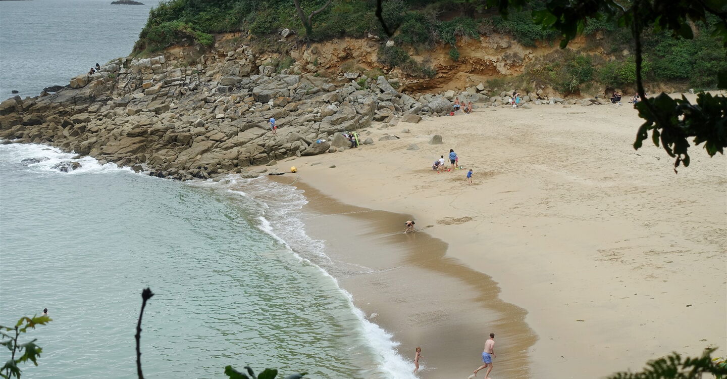 Wir gehen ein kurzes Stück auf der schmalen Straße links bergauf, prachtvolle und farbenfrohe Anwesen schmiegen sich in den steilen Hang. Bei einem weißen Haus zweigen wir halb rechts auf die Piste ab. Es folgt ein Wegabschnitt mit einer tollen Aussicht, man schaut über die Bucht Bai de la Vierge bis auf das offene Meer. Kurz später entfernt sich der Pfad von der Küste, nach einem steilen Abstieg und hinter einer Hauszufahrt kann man rechts zu einem Strand heruntergehen. Sonst gehen wir geradeaus und bergauf an einer mit Efeu überwucherten Mauer entlang. Hinter einem grünen Einfahrtstor halten wir uns halb rechts, passieren ein Metalltor und erreichen die wunderschön gelegene Bucht des 03 Plage de Saint-Quiriou (18 m).