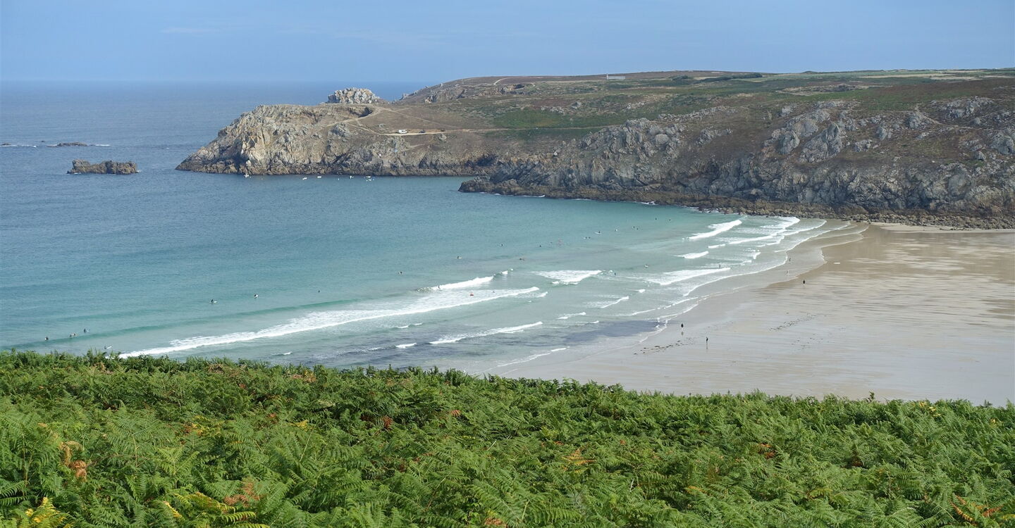 Am Start und Ziel am Parkplatz gehen wir links vom Restaurant in Richtung Meer und 01 Baie des Trépassés (11 m). Kurz vor dem Ufer gehen wir links auf einem Pfad auf einen Bunker zu, um dort über Treppen auf die Klippen zu gelangen. Bei einer ersten Weggabelung gehen wir noch oberhalb des Strandabschnitts weiter. An der nachfolgenden Stelle, wo sich ein Zaun befindet, zweigt nach links ein schmaler Pfad durch Farne ab. Hinter einer Steinmauer ignorieren wir den rechten Abzweiger und gehen weiter auf die Anhöhe zu. Ein weiterer rechter Abzweiger wird ignoriert. Bei einer Kreuzung mehrerer Wege gehen wir links an einem hellblauen Tor vorbei, um nach 10 m rechts den Weg durch die Farne zu nehmen und in Richtung der dahinter liegenden Häuser zu gehen.