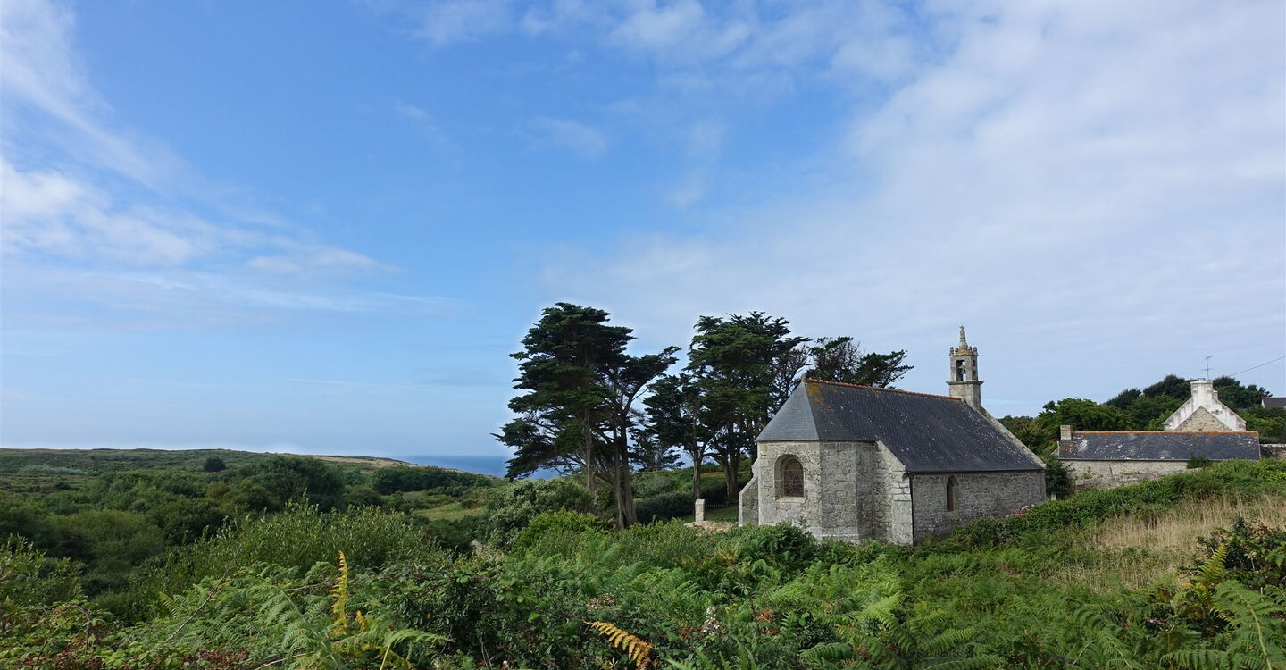 Auf der darauffolgenden Straße gehen wir 100 m links, um dann rechts in die Straße einzubiegen. Am Ende der Straße halten wir uns halb rechts, es geht weiter auf einem schmalen Pfad entlang einer gelben Hausmauer. 50 m vor der 02 Chapelle St. Michel (55 m) zweigen wir nach links auf einen betonierten Pfad ab. Wir bleiben auf dem Hauptweg, bis wir 40 m vor einem Steinhaus links auf die Straße abbiegen. Am Ende der Straße gehen wir rechts an der hohen Mauer entlang. Hinter dem steinernen Kreuz gehen wir links und dort, wo die Straße endet, setzen wir unseren Weg nach rechts fort. Schließlich gehen wir nicht links Richtung Kerhuan, sondern rechts bis zu einer Anhöhe bei einem Felsen.