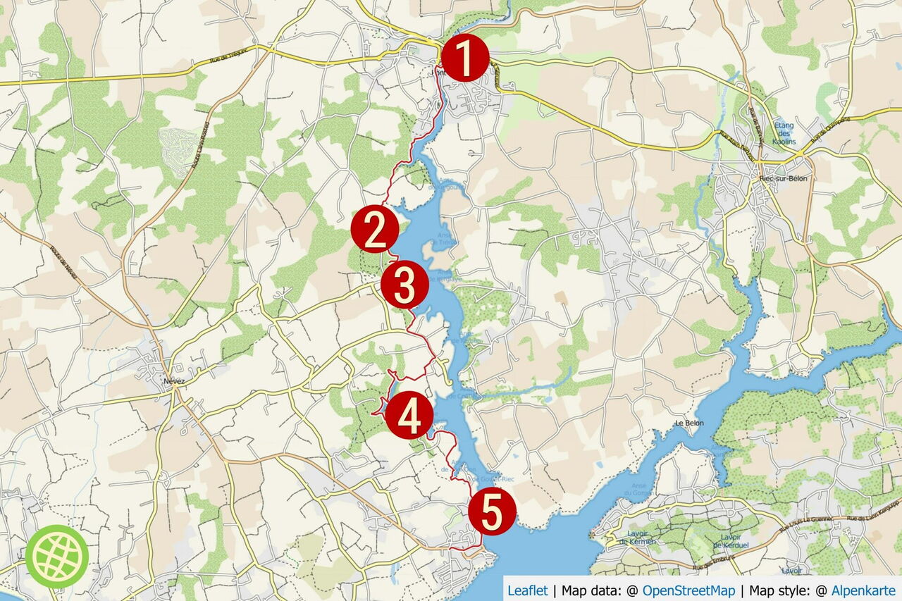 Mittelschwere Wanderung mit erhöhtem Navigationsaufwand aufgrund der vielen Wegverzweigungen. Art des Weges: 50 % Pfad und 50 % Straße. Zusatzausrüstung: Keine. Einkehr: Bei km 5,52 verlässt man die Wanderung zum Le Bistrot de l'Écailler – ein hübsches Bistro mit einer kleinen Terrasse am Ufer des Aven. Serviert werden tagesfrischer Fisch und Meeresfrüchte. | €€ | Au Port, 29920 Névez | Geokoordinaten 47.820138 -3.746401 | Beste Wanderzeit: Ganzjährig. Sehenswert Region: In 16 km Entfernung befindet sich das Château de Keriolet, Geokoordinaten 47.886594 -3.908016.