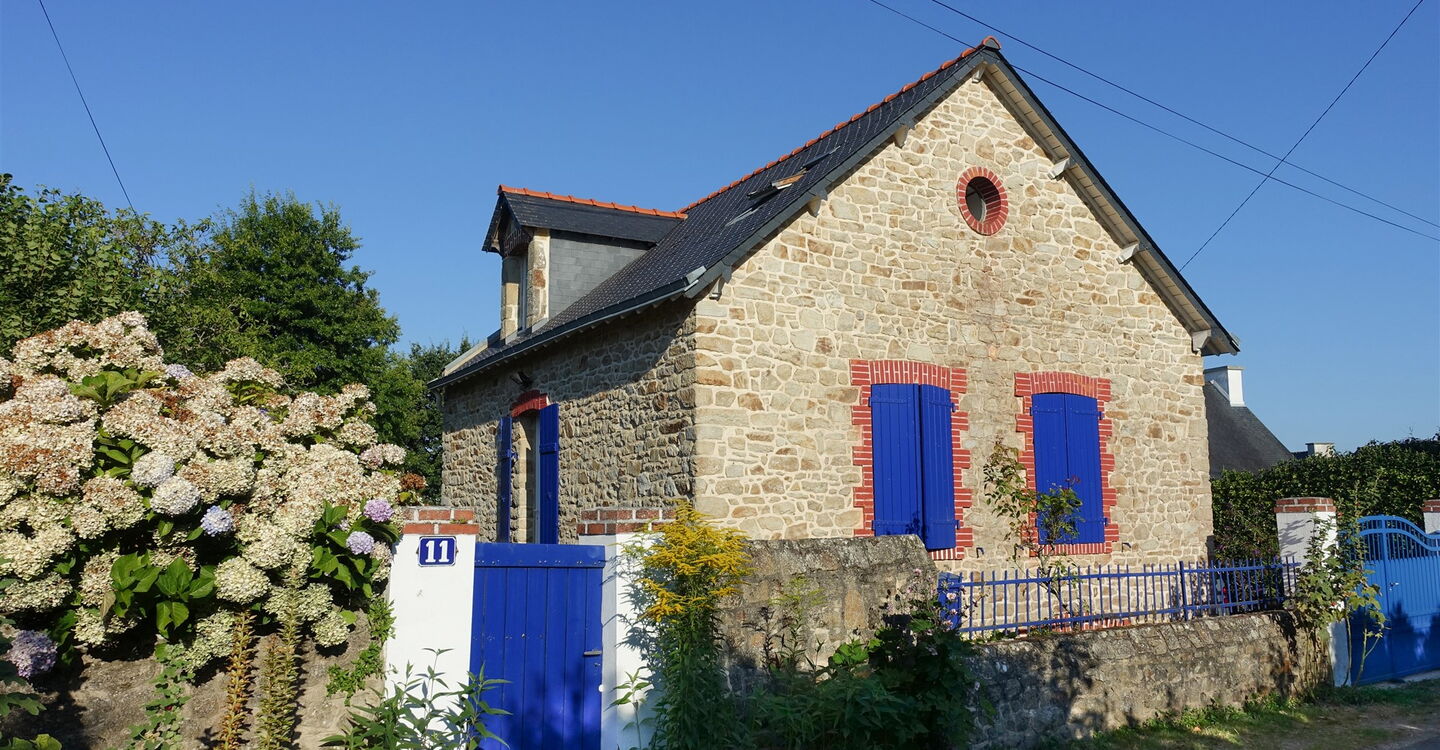 Nach einem Mini-Strandabschnitt gehen wir auf der nun vorhandenen Promenade weiter. Wo diese in eine Asphaltstraße mündet, biegen wir rechts in die Rue des Vierges ab und verlassen die 04 Bucht von Kerners (6 m). Die Gasse endet und wir gehen links, um bei der nächsten Möglichkeit rechts zu gehen, nun entlang von Ferienhäusern. Die Einbahnstraße mündet in eine größere Straße und wir gehen rechts auf der Route de Kerners, um dann nach 350 m bei einem Haus mit grünen Fensterläden halb rechts in die Piste einzubiegen.