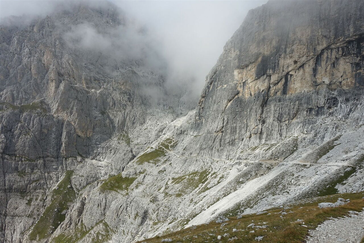 Sobald die steilen Felswände links von uns in ein Felsband – teils Schuttband – übergehen, führt der Pfad durch dieses hindurch, nun in östliche Richtung. Wir erreichen einen rechten 03 Abzweiger (2.285 m), den Abstieg mit der Wegnummer 702 nach San Martino di Catrozza. Wir gehen aber geradeaus weiter, nun auf dem Wanderweg 715. Auf einem kleinen Plateau queren wir mit Gras bewachsene Wiesen, bis wir dann einen ca. 200 m langen und mit Stahlseilen gesicherten Wegabschnitt erreichen. Dieser führt größtenteils entlang eines schmalen Felsbands. Der nicht schwindelfreie und trittsichere Wanderer legt nun das Klettersteigset an.
