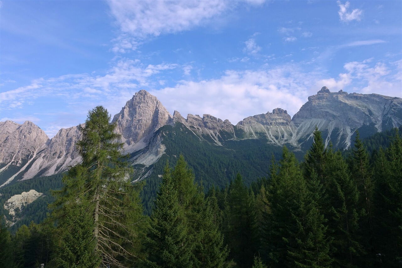 Vom 01 Rifugio Dolomites (2.160 m) gehen wir auf der weiterführenden Piste in östlicher Richtung an weiteren Gebäuden vorbei. Richtung Süden schaut man direkt auf die Gipfel des 2.425 m hohen Sfornioi di Mezzo und des 2.413 m hohen Sassolungo di Cibiana.