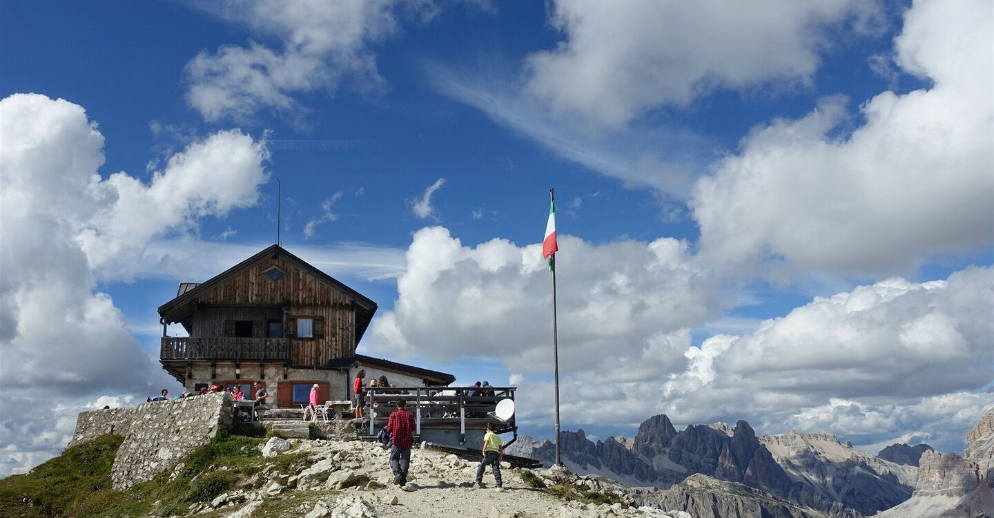 Vom Sessellift und dem Rifugio Averau an der Forcella Nuvolau steigen wir in östlicher Richtung auf dem Wanderweg 439 gemächlich über einen Bergkamm bis zum extrem aussichtsreichen Gipfel des Monte Nuvolau auf. Wie ein Adlernest liegt hier das 05 Rifugio Nuvolau (2.575 m).