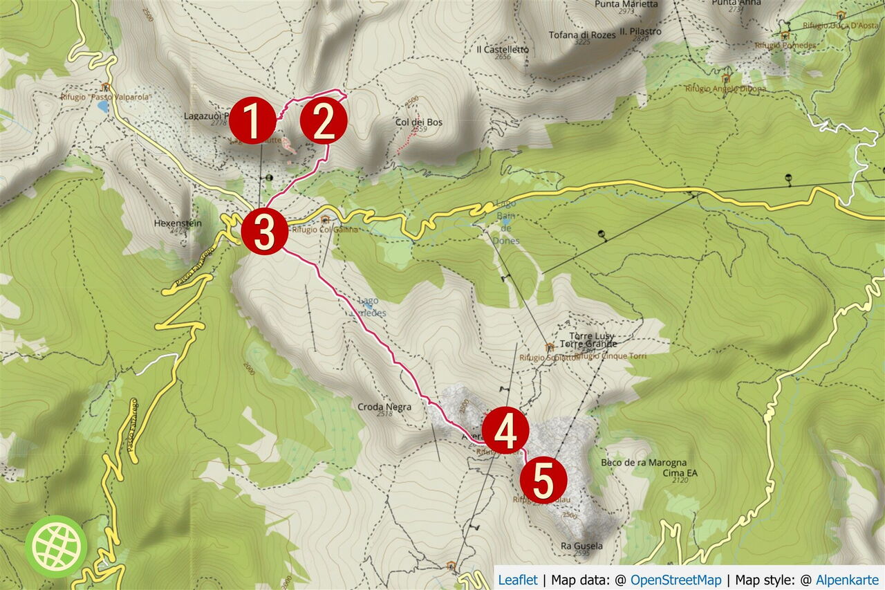 Vom 01 Rifugio Lagazuoi (2.778 m) gehen wir die wenigen Meter zur Seilbahnstation herunter und folgen dann dem mit Holzpfählen befestigten Wanderweg 20. Es geht vorbei an Stellungen aus dem Ersten Weltkrieg und weiter bis zur Forcella Lagazuoi. Bei dieser kleinen Einsattelung gehen wir wenige Meter geradeaus bergauf und folgen dann dem weiterführenden Wanderweg 20 B. Der Pfad führt in Richtung der mächtigen Westwand der Tofana di Rozes. Es geht parallel zu Metallgerüsten zur Lawinensicherung bis zum 2.507 m hohen Forcella Travenanzes.