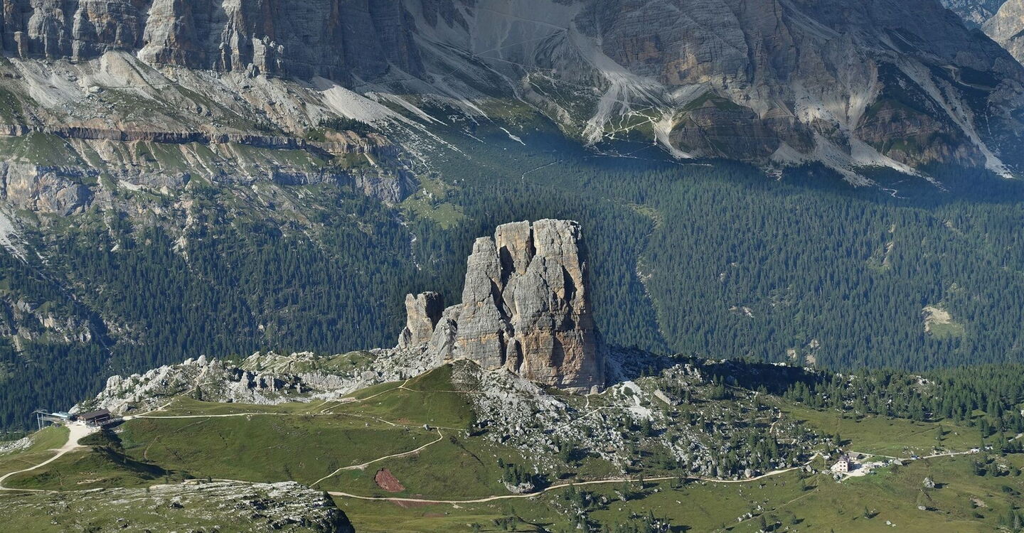 Sobald wir wieder Bergwiesen erreichen, wird der Pfad zum breiten Wanderweg. Vor einem großen Haus mündet von scharf links der Wanderweg 444 in den unsrigen. Dieser kommt vom Rifugio Cinque Torri und dem Klettersteig Via Ferrata Ra Gusela (Wanderweg 438). Auf dem breiten Wanderweg geht es bequem zum 05 Passo Giau (2.236 m) mit dem gleichnamigen Berggasthof.