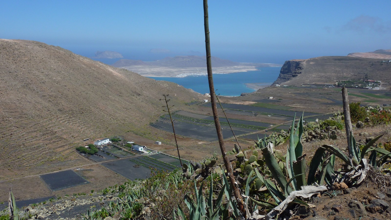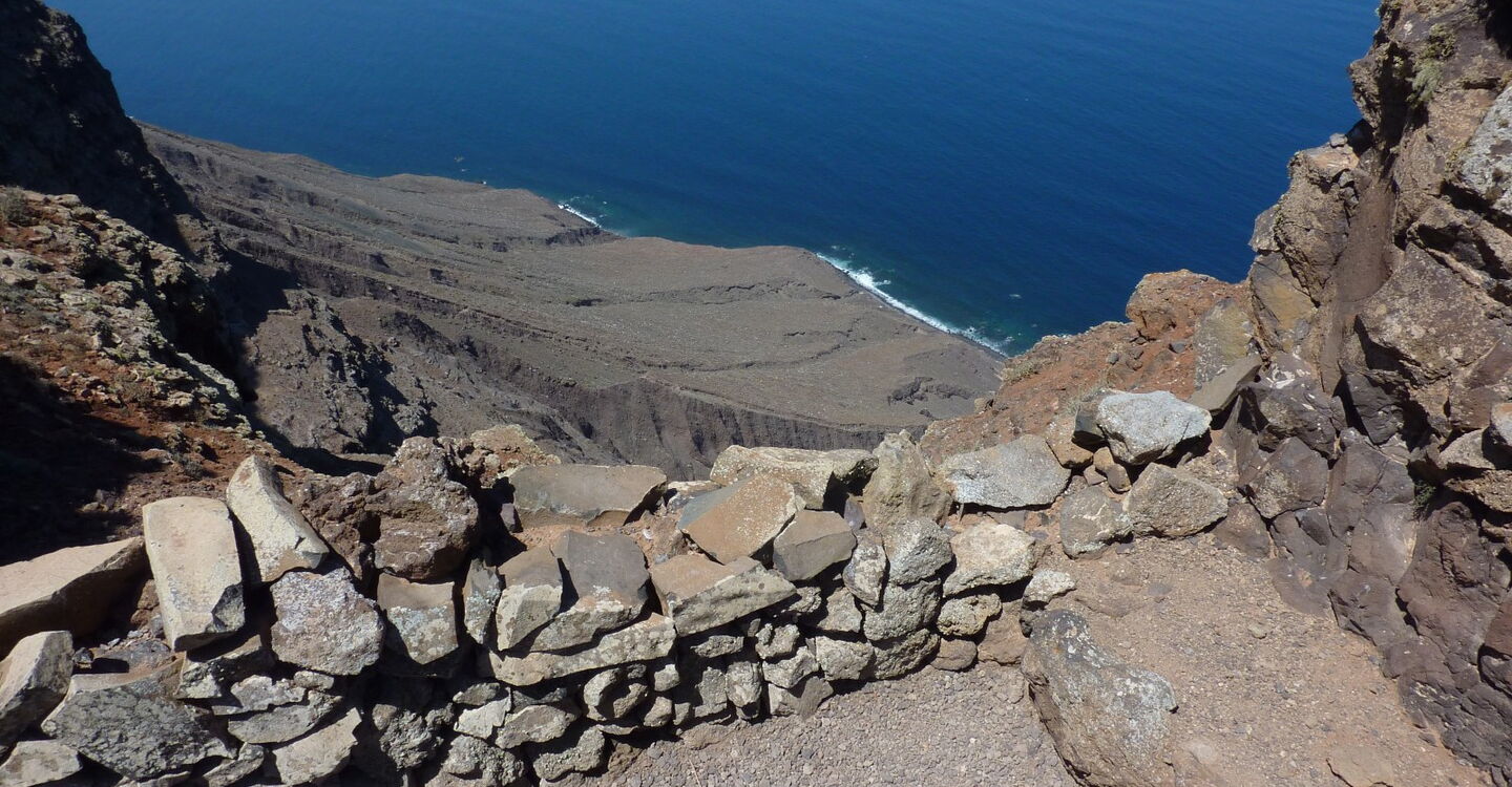 Parallel zu unserer Gratwanderung verläuft im Talgrund ein Wirtschaftsweg, zu dem wir im weiteren Verlauf der Wanderung absteigen werden. Der Pfad führt durch brachliegende, terrassenförmig angelegte Felder, bis wir nach einem kurzen Stück bergab den (03) Mirador (475 m) erreichen. Von diesem beeindruckenden Aussichtspunkt schaut man senkrecht zum Atlantischen Ozean herunter und entlang der Steilküste des Risco-de-Famara-Gebirgsmassivs. Vom Mirador steigen wir direkt zum Wirtschaftsweg ab und gehen dann rechts bergauf weiter.