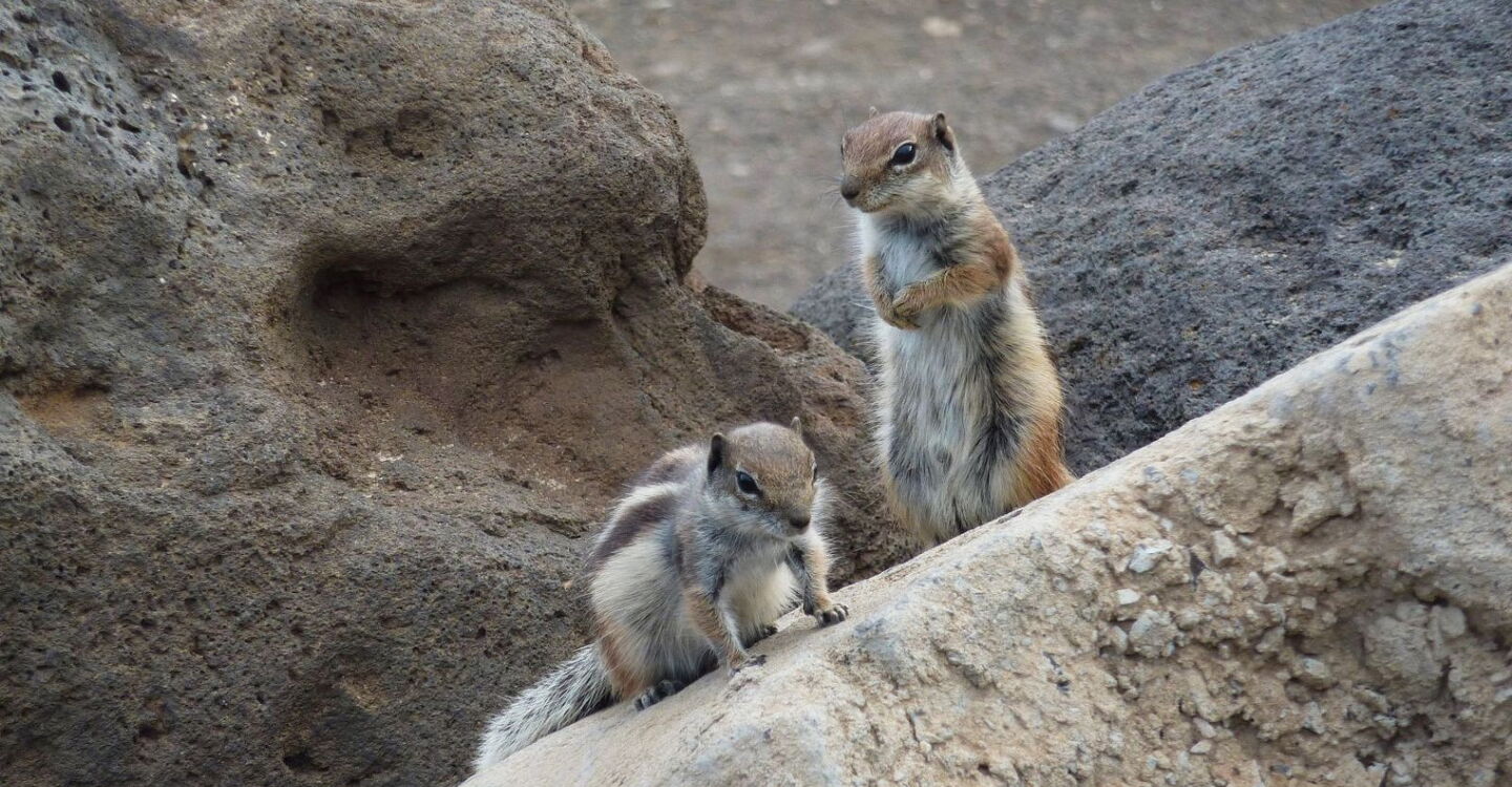 Nachdem wir das über uns liegende Hotel Club Paraiso Playa hinter uns gelassen haben, erreichen wir das Barranco Esquinzo. An diesem Wegpunkt bitte unbedingt ein wenig ins Barranco – bis zum Parkplatz – vorgehen, wo sich viele fast zahme Atlashörnchen angesiedelt haben. Das (03) Atlashörnchen (16 m) kam vor etwa 25 Jahren auf dem Schiffsweg nach Fuerteventura. Da es dort sehr ähnliche Lebensverhältnisse wie in Marokko vorfand, haben sich die anfangs lustigen Nager schnell zur Plage entwickelt.