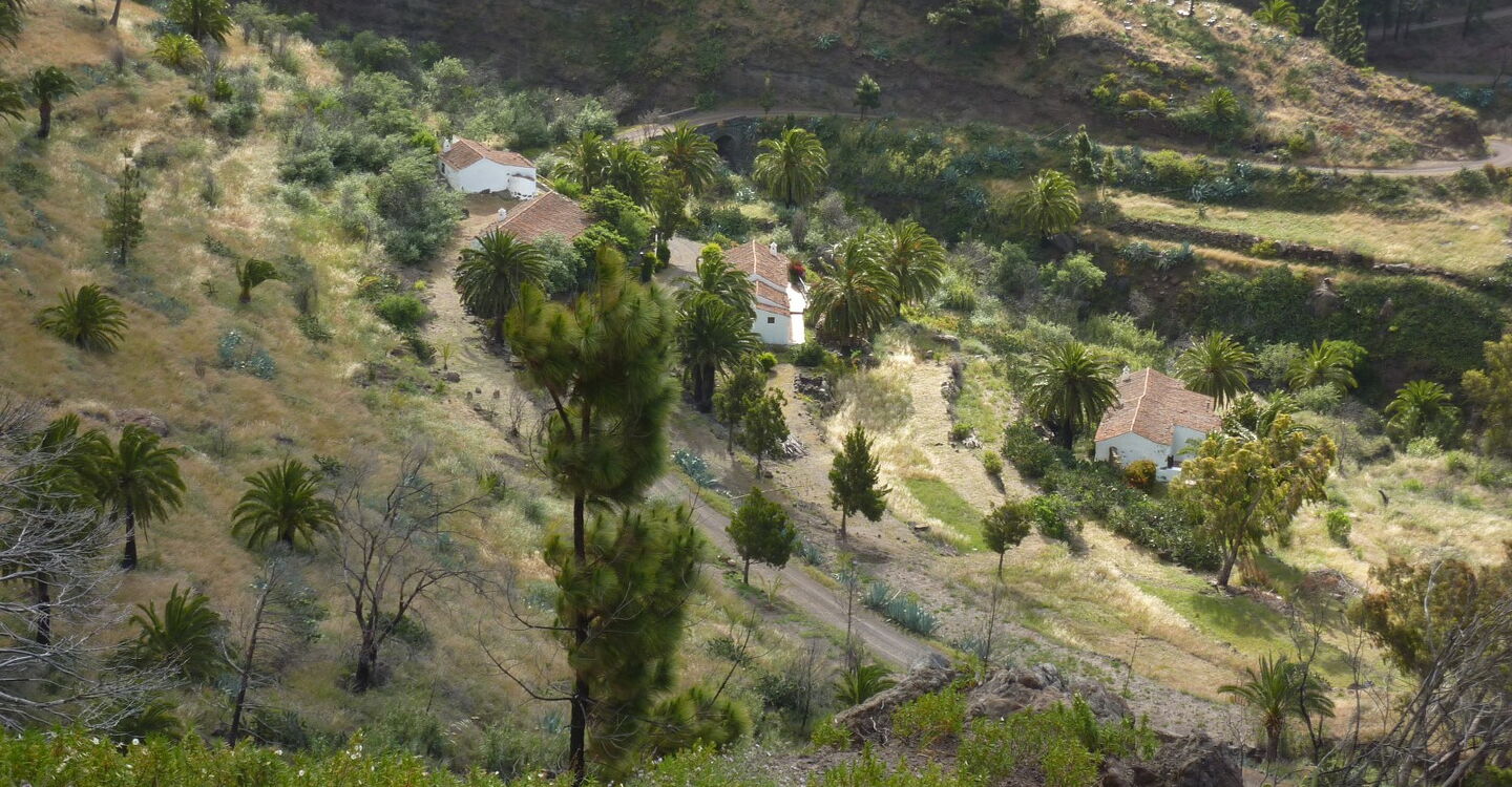 Nach 2,5 km erreichen wir eine Piste und das malerisch gelegene Dörfchen (02) Benchijigua (643 m). Mithilfe von EU-Geldern und finanzkräftiger Unterstützung des Reeders Fred Olsen wurden an dieser Stelle Fincas im altkanarischen Stil restauriert. Diese stehen nun den Urlaubern als Ferienhäuser zur Verfügung. Geht man direkt hinter der Casa Benchijigua halb rechts weiter, so erreicht man die bescheiden gehaltene Kapelle Ermita de San Juan (Las Cabezadas) aus dem letzten Jahrhundert. Für den weiteren Weg gehen wir direkt hinter der Casa Benchijigua rechts auf der Piste weiter und queren auf gleicher Höhe das Dorf, bis die Piste eine Linkskehre macht und wir einen Staudamm unterhalb von uns liegen lassen. An dieser Stelle geht die Piste in einen Pfad über.