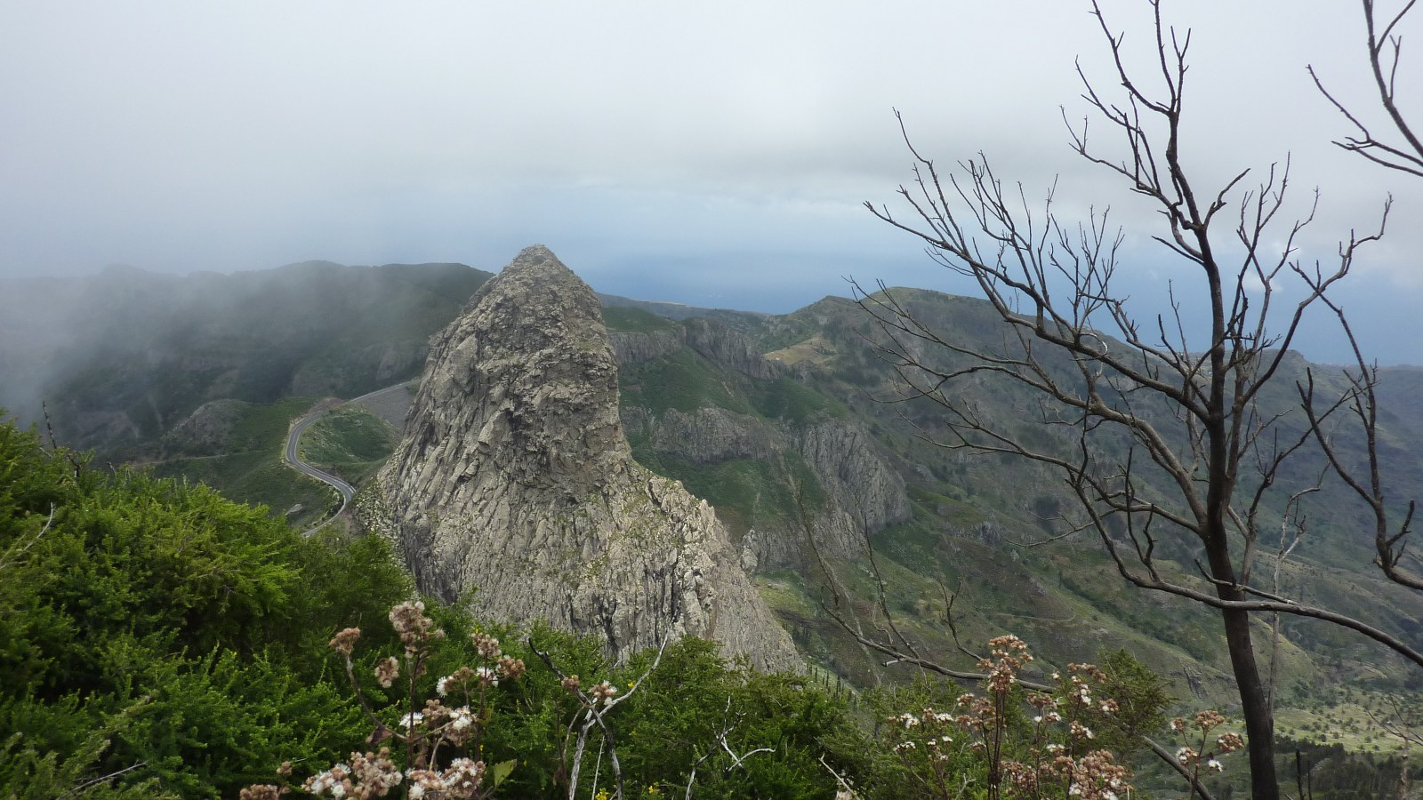 Am Parkplatz des Mirador de Tajaque queren wir die GM-2, um diese nach 400 Metern auf einer Brücke zu überqueren. Schließlich treffen wir auf den Abzweiger rechts bergauf, den wir zum 100 Meter entfernten (05) Mirador de Agando (1316 m) begehen. Dort erwartet uns eine Aussichtsplattform par excellence. Vom Cumbre de Taraque genießt man eine 360°-Panoramasicht über die folgenden drei Naturschutzgebiete: den Nationalpark Parque Nacional de Garajonay, das Denkmal Monumento de los Roques und das Naturreservat Reserva Natural Integral Benchijigua. Der Höhepunkt ist zweifellos der unterhalb von uns stehende El Roque de Agando, ein 1251 m hoher Felsriese. Nachdem wir die Aussicht genossen haben, gehen wir 100 Meter zum Hauptpfad zurück, dort rechts zur GM-2 herunter, queren diese und halten uns sofort halb rechts Richtung La Laja, um den Mirador Roque de Ojila zu erreichen und nun nur noch die wenigen Meter zum Parkplatz herunterzugehen.