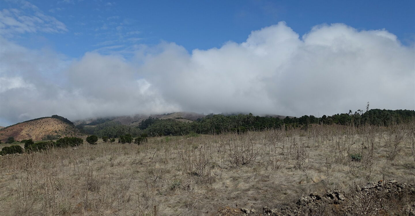 Nach insgesamt 475 m auf dieser Straße – oder 50 m hinter dem Verkehrsschild kurvige Straße – verlassen wir die (03) Straße HI-10 (819 m) nach links und wechseln auf die steil ansteigende Asphaltstraße. 100 m vor einem riesigen Eukalyptusbaum – hier steht halb links ein Wacholderbaum – gehen wir links. Hinter einem rechts liegenden Ziegengatter wird der Weg zum Pfad – im Frühjahr ist er oft stark verwachsen. Es folgt ein diffuses Wegstück. Wir passieren zwei Ziegenzäune und orientieren uns in Richtung der oberhalb liegenden Einsattelung. Bei einem Mauerdurchbruch gehen wir auf einem Trampelpfad rechts an der Mauer entlang. Wir gehen direkt auf eine weitere Mauer zu, um an dieser halb rechts vorbei auf eine etwas erhöht liegende Piste zu gelangen.
