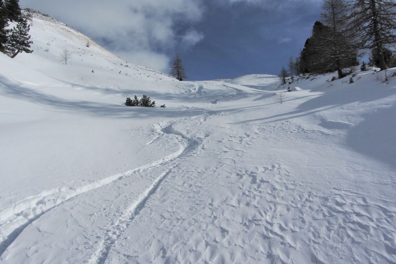 Je nach Schneebedingungen kann man mehrere Varianten nehmen, bis man automatisch in die weiße Rinne der Pra de Ciamena kommt, die bis in den Talgrund führt.