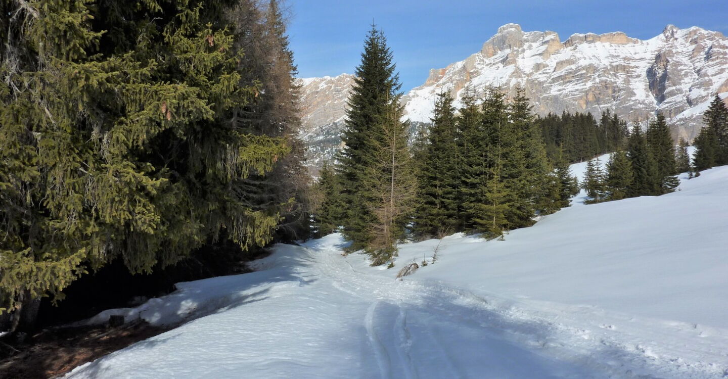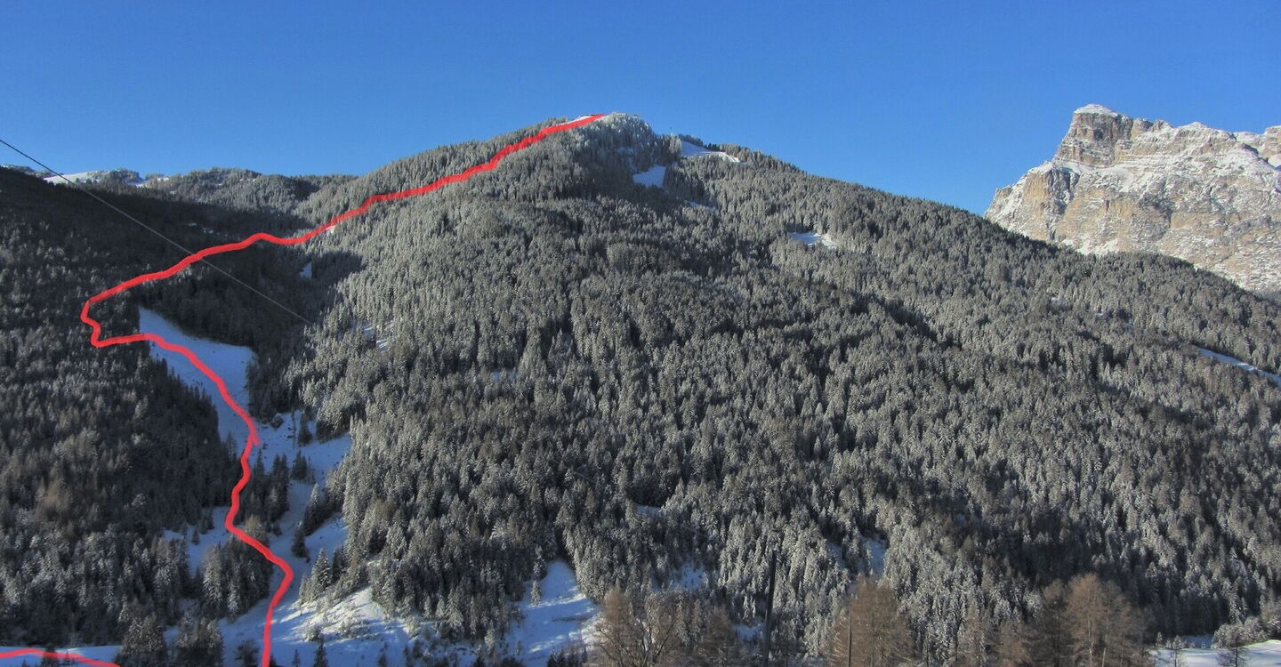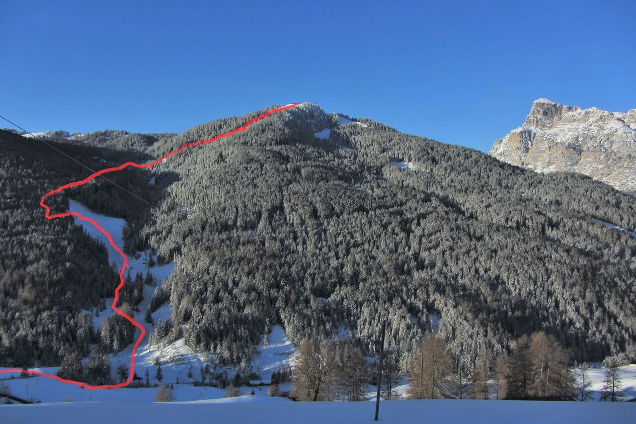 Einfache Orientierung. Man kann unter den kleinen Tannen fahren und bei genügend Schnee auch unter den großen. Die Abfahrt führt über einen Nordosthang. Folgende Ausrüstung wird empfohlen: Produkte für alpine Sicherheit im Schnee, Freerideski und Skitourenhelm. Es empfiehlt sich die Einkehr in das Rifugio Ütia Bamby an der Piste 16a. Beste Jahreszeit: Januar bis April. Uns erwarten kurze Stücke mit bis zu 25° Hangneigung.