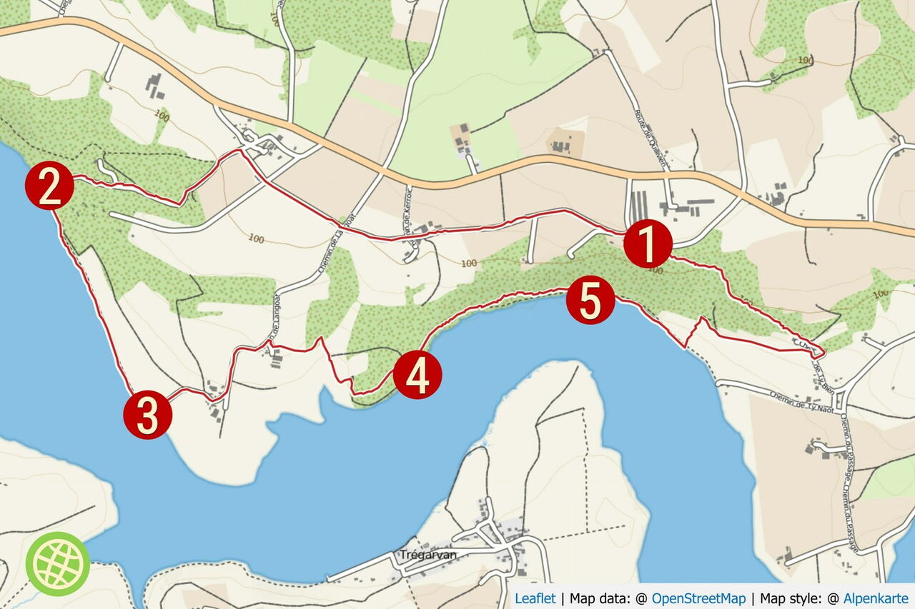 Mittelschwere Wanderung bei einfacher Orientierung. Der Pfad oberhalb des Flusses ist an einigen Stellen leicht ausgesetzt und erfordert Trittsicherheit. Art des Weges: 20 % Straße, 40 % Piste und 40 % Pfad. Zusatzausrüstung: Keine. Einkehr: Keine. Beste Wanderzeit: Ganzjährig. Achtung: Bei einem extrem starken Tidenhub kann es vorkommen, dass Teile des Weges überschwemmt sind. Sehenswert Region: Das 18 km entfernte Musée de l'ancienne Abbaye de Landevennec, Geokoordinaten 48.290078 -4.266276.