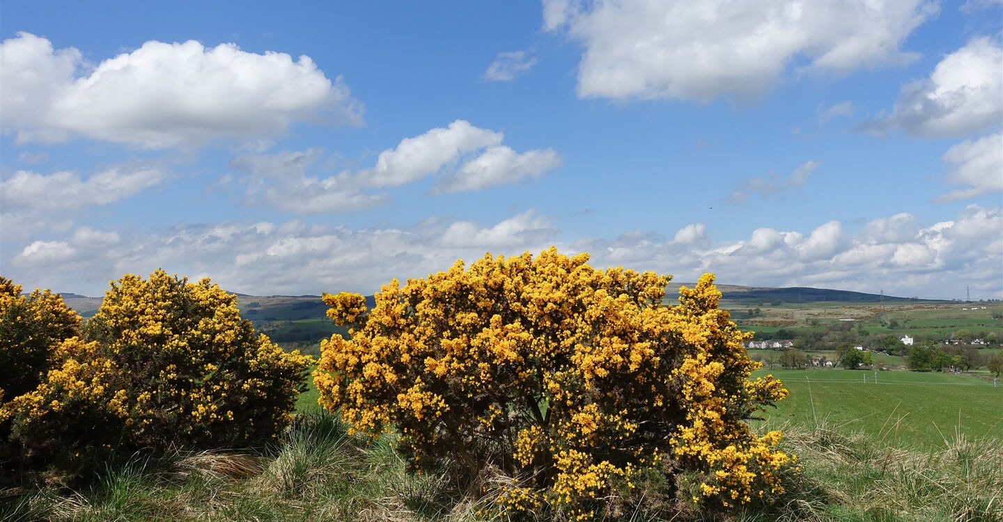 Den nachfolgenden linken Abzweiger ignorieren wir und gehen geradeaus weiter durch das Gatter. Im Frühling führt der Pfad durch farbenprächtige Ginstersträucher, einige Exemplare sind bis zu 2 m hoch. Ihre wohl zufällig gleichförmige Anordnung gleicht schon fast einer 02 Ginster-Allee (2 m), der betörende Duft erfüllt die Landschaft.
