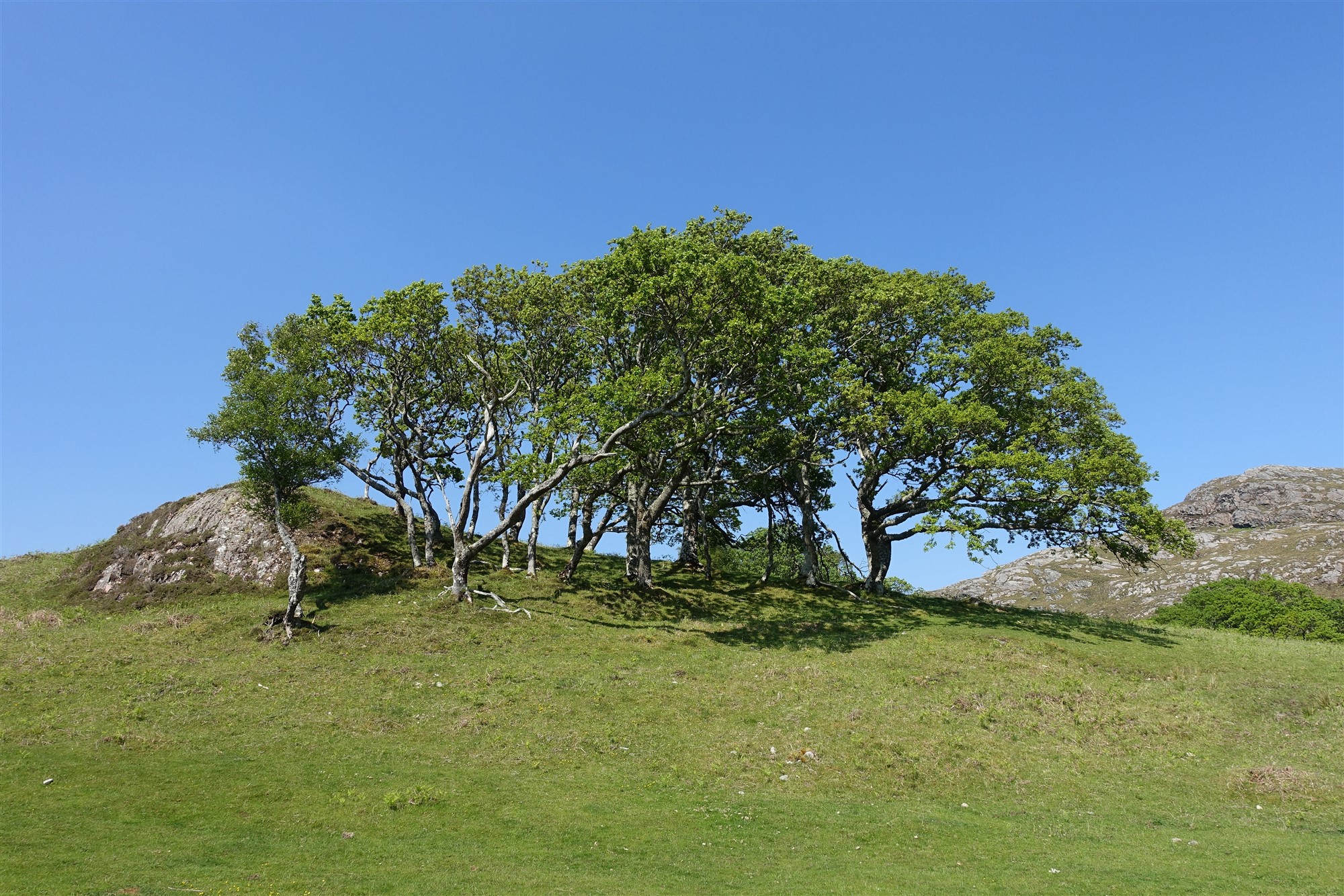 Nach kurzem Abstieg queren wir einen kleinen Bachlauf und erreichen den 03 Loch Kernsary (17 m). Der Pfad führt etwas erhöht oberhalb des Ufers entlang, so schaut man über den See bis zu den zahlreichen Gipfeln der Torridon-Berge. Zum Ende des Sees wird der Weg etwas steiniger, wir passieren ein Gatter und queren eine große Wiese mit einer Vielzahl von schönen Eichen.