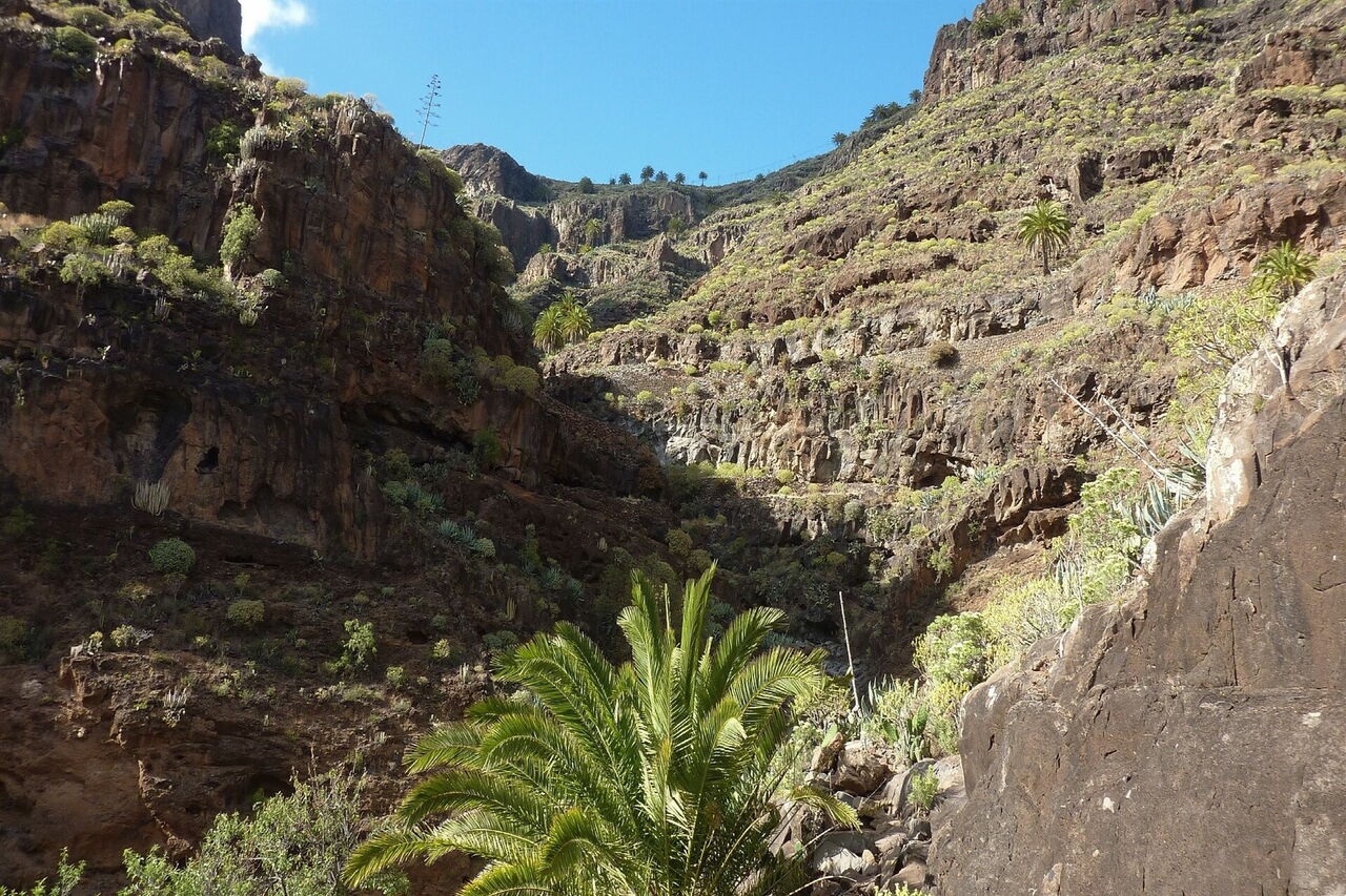 Im sonnigen Süden von La Gomera, westlich vom Flughafen, befindet sich versteckt und unentdeckt das beeindruckende Barranco Erese, das an seinem Schluchtauslauf einen wunderschönen Strand geformt hat. Selbst nach einem trockenen Sommer versiegte das Quellwasser nicht. Diese Besonderheit der Natur hatten sich Bauern zunutze gemacht und im oberen Teil der Schlucht in beeindruckender Lage Terrassenfelder angelegt. Heutzutage ist die gesamte Besiedlung verlassen und dem Verfall preisgegeben. Es folgt eine spektakuläre Wanderung im Barranco, bis wir auf einen alten Verbindungsweg durch die Schlucht treffen. Hier kann man links bergauf den schwierigen Abstieg wählen oder rechts bergauf eine gemütliche Variante.