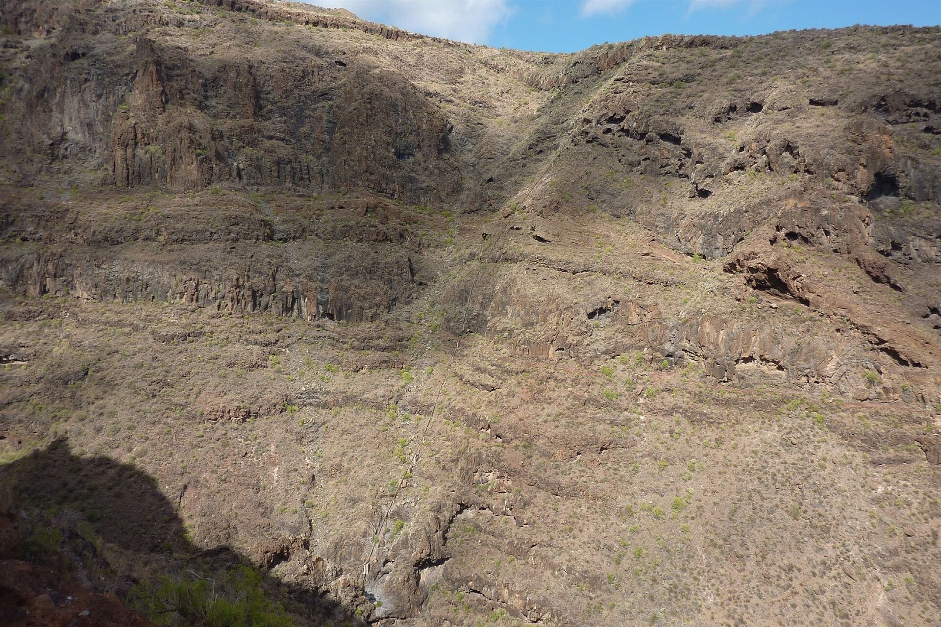 Vom (01) Start Ziel GM-3 (503 m) mit der kleinen Parkbucht steigen wir weglos über einen Sandhügel Richtung Meer, gehen ein kurzes Stück über in die Überreste von Terrassenfeldern. An der Schotterpiste angekommen gehen wir rechts in die Schlucht. Links von uns, gut 200 m tiefer gelegen, hat sich das Barranco Erese in die Natur erodiert.
