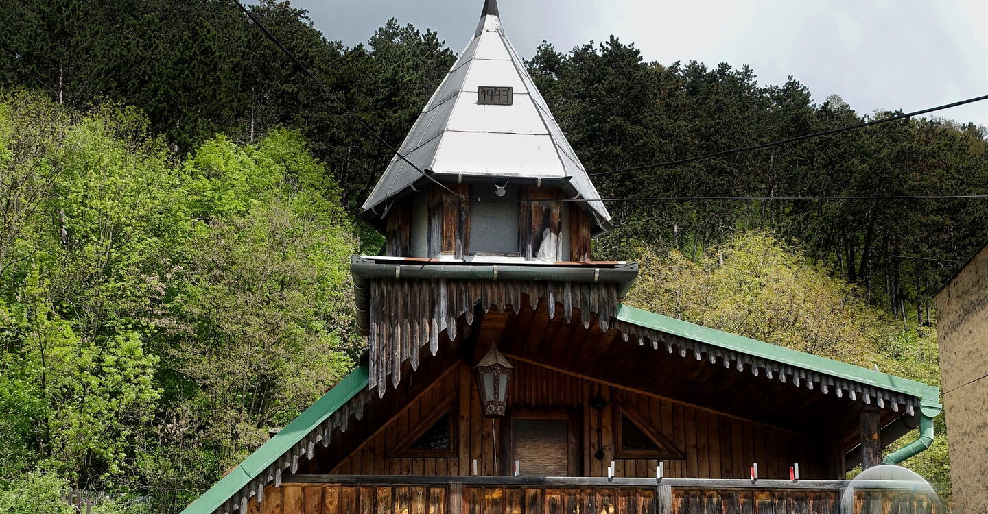 Bei der nachfolgenden Informationstafel halten wir uns rechts, gehen dann halb links auf dem Pfad über die Wiese, überqueren beim Heiligenschrein die Straße und steigen durch den Berghang unterhalb des Schlosses bis zum 02 Hrad Ľupča (439 m) auf. In den Monaten Juli bis September sind die Öffnungszeiten täglich – außer Montag – 10:00 Uhr bis 15:30 Uhr. Die Besichtigung muss vorher angemeldet werden (Telefonnummer: +421484187429) und ist nur mit Führung möglich. Auf der Zufahrtsstraße zum Schloss gehen wir leicht bergab, lassen den ersten rechten Abzweiger aus, biegen dann aber hinter der Linkskurve der Straße scharf rechts ab.