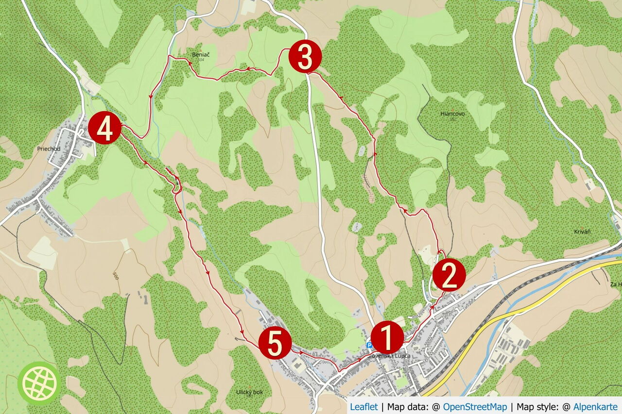 Bei dem ersten Haus und einem Lichtmast verlassen wir die Straße nach links und folgen der Ausschilderung Richtung Slovenská Ľupča. Nachdem der Waldweg eine Linkskurve beschrieben hat – bei einer Informationstafel –, kann man den Hauptweg verlassen und links bergab durch zwei Wildbachbetten zu einem kleinen, romantisch liegenden Stausee gelangen. Hierzu muss man jeweils barfuß durch die Bachbetten gehen. Wieder zurück auf dem Hauptweg geht es zunächst entlang von Feldern, bis dann der Wirtschaftsweg in eine asphaltierte Straße übergeht. Hinter einer Brücke erreichen wir 05 Slovenská Ľupča (385 m). Hier gehen wir durch ein kleines Wohngebiet bis zur Hauptstraße, um dort links bis zum Ausgangspunkt weiterzugehen.