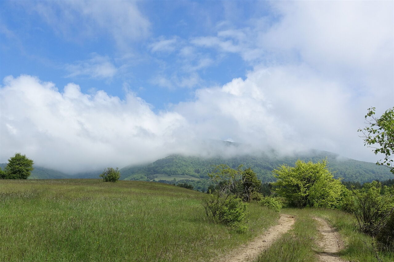 Ca. 250 m nach der Linkskehre des Weges gelangen wir in eine Senke. An dieser Stelle gehen wir nicht geradeaus unter der Hochspannungsleitung weiter, sondern biegen scharf rechts ab. Nun fast weglos geht es ca. 500 m durch ein kleines Tal, auf der linken Seite befindet sich ein Waldstück. Sobald wir auf den Feldern unterhalb einer quer verlaufenden Stromleitung angekommen sind, gehen wir in westlicher Richtung – im rechten Winkel zu der Stromleitung – auf ein oberhalb liegendes Waldstück zu. Wir queren eine Fahrspur und gehen halb rechts durch eine ca. 30 m breite Lichtung. Dann queren wir einen Wildbachlauf und gehen auf der nachfolgenden Asphaltstraße links bis zum 04 Ortsanfang von Priechod (421 m).