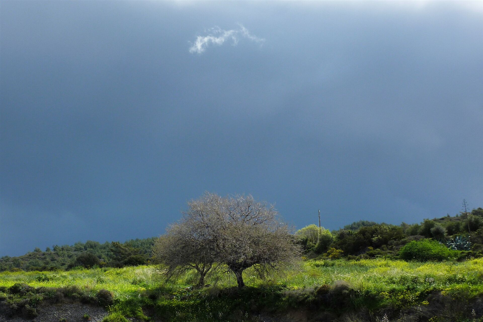 Durch ein kleines Hochtal geht es vorbei an Olivenbäumen, Eukalyptusbäumen, Weinreben und Feigenbäumen bis zu einem Bach. An diesem (02) Abzweiger (27 m) gehen wir links auf der Schotterpiste bergauf und nicht geradeaus zur Hauptstraße. Immer wieder treffen wir auf Abzweiger, wir gehen aber kontinuierlich bergauf auf der nun sehr breit gewordenen Schotterpiste.