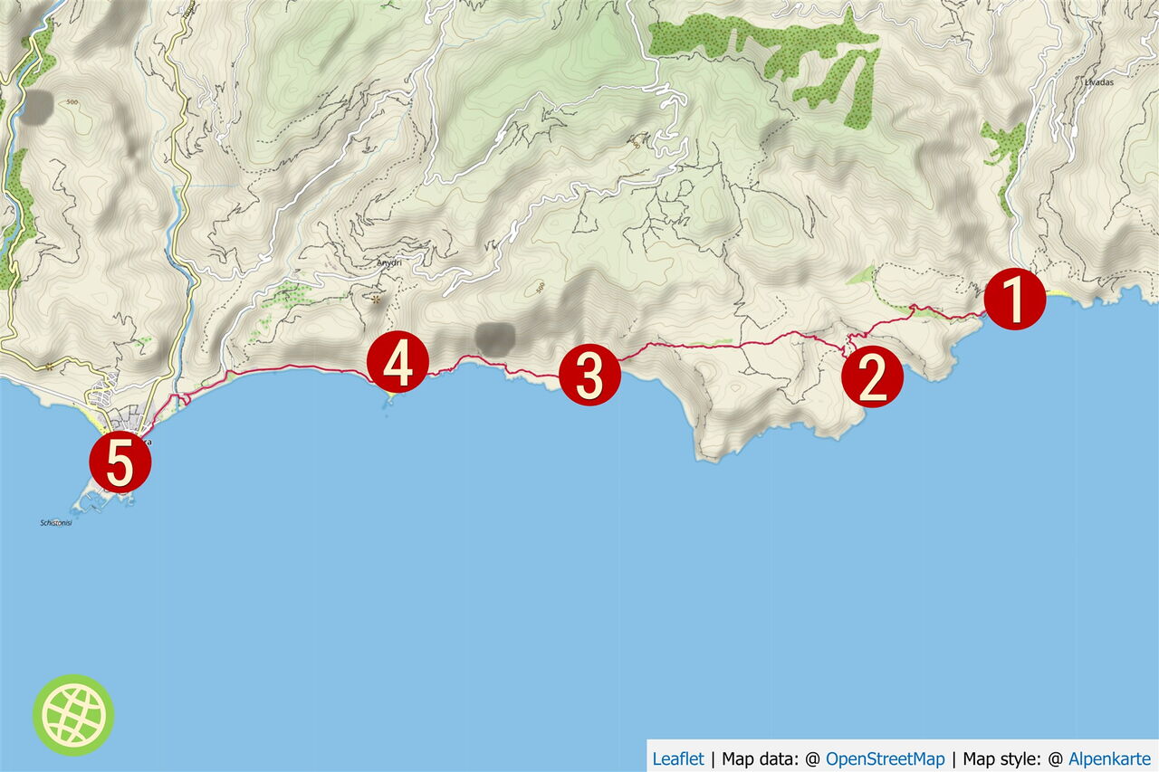 Nach weiteren 2,6 km erreichen wir den wunderschönen, aber bereits sehr touristischen 04 Astropelekita-Strand (1 m). Dieser teilt sich auf in die Strandabschnitte von Gyaniskari und Dyaliskari, die durch eine Landzunge voneinander getrennt werden. Der westliche Strandabschnitt besteht aus Kieselsteinen, der östliche aus weißem Sand.