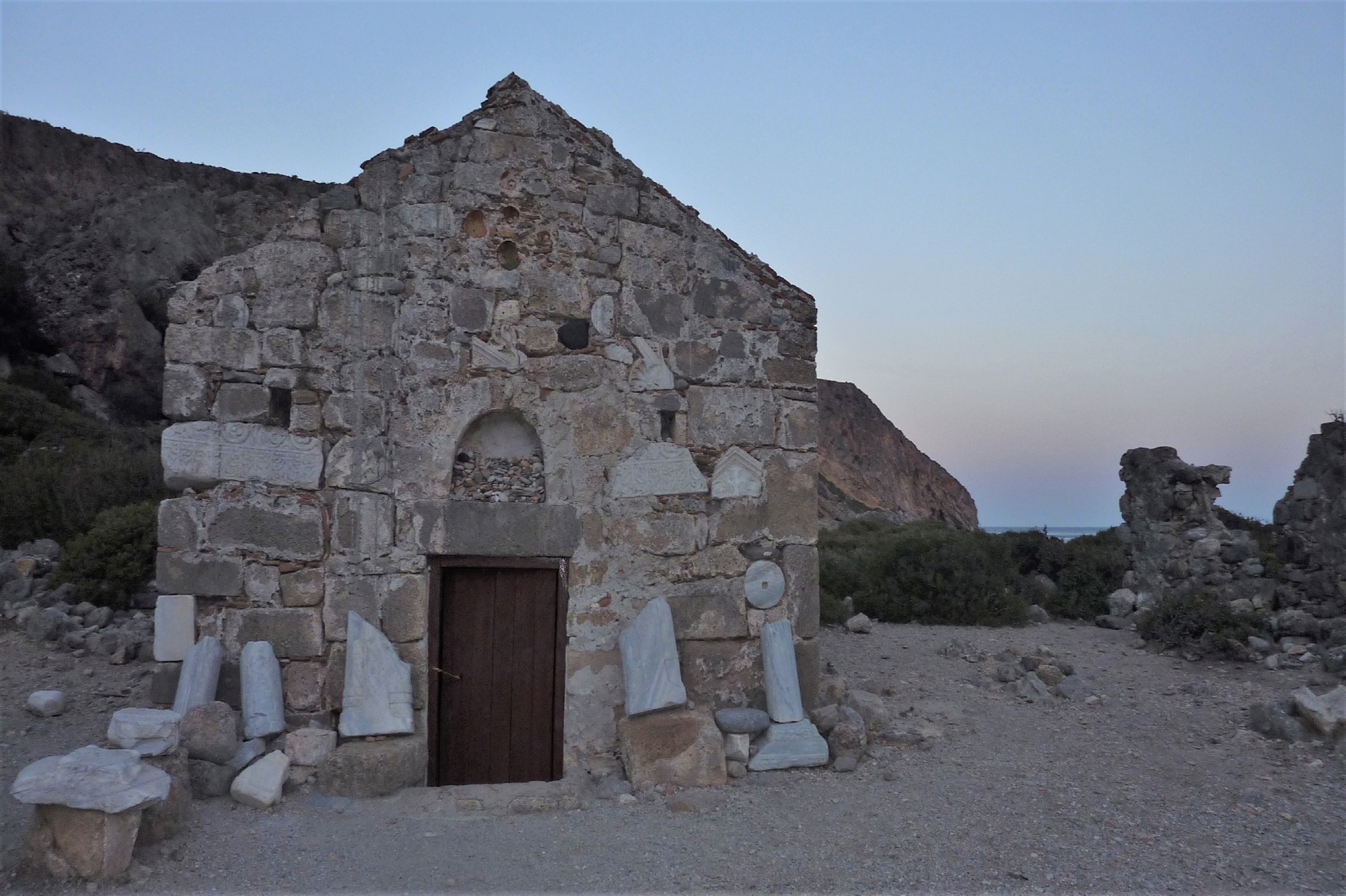 Nach 1,25 km verlässt ein Pfad nach links die Schlucht. Wir gehen über eine karge Hochebene und erreichen den Abstieg nach 02 Lissos und Agios Kirikos (2 m). Lissos war einst eine blühende antike Stadt aus der hellenistischen, römischen und byzantinischen Periode, bis es von den Sarazenen zerstört wurde. Die Bodenmosaiken des Tempels der Asklepios sind sehr gut erhalten. Auch gibt es in diesem Tal eine Quelle. Im unteren Teil des Tals befinden sich ein kleiner Bootsanleger und die Kirche Agios Kirikos. Geht man in einem großen Halbbogen durch die Schlucht, so kommt man an Prachtexemplaren von alten Olivenbäumen sowie Ruinen aus der Neuzeit vorbei. Wir verlassen die Schlucht auf einem Pfad in westliche Richtung.