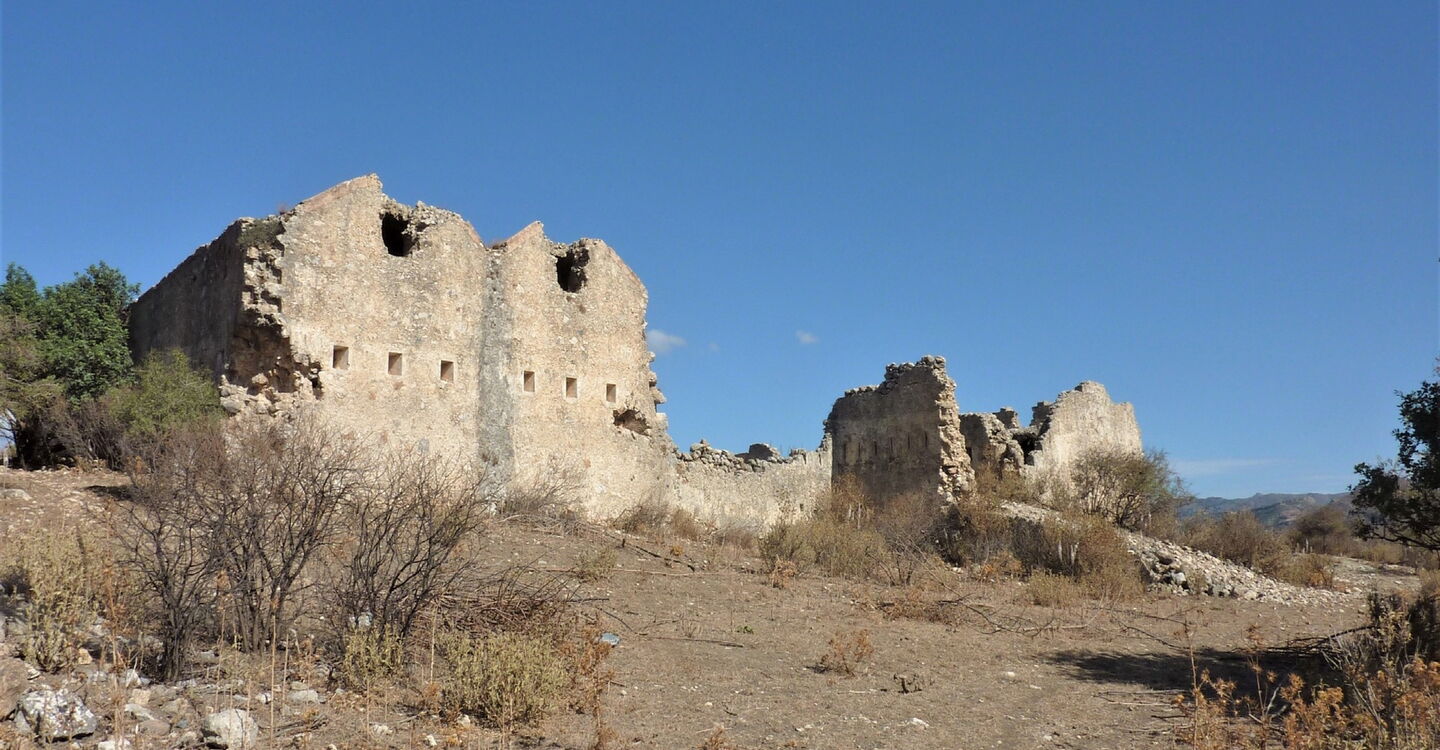 Auf dieser gehen wir 910 m rechts, um bei dem Verkehrsschild – kurvenreiche Strecke – auf der Piste links bergauf zu gehen. Wir kommen vorbei an einem Container, der Weg endet, wir gehen links und sofort wieder rechts, auch dieser Weg endet nach 130 m. Links laufen wir auf der zunächst betonierten Straße bergauf, bis wir nach 480 m den rechten Abzweiger durch das Ziegengitter zu den Ruinen des 03 Kastells Koules (368 m) nehmen. Es wurde 1866 vom osmanischen Militär errichtet und ist mit 44 x 30 m Fläche relativ groß. Es liegt erhaben auf einem Hügel, ideal, um die Umgebung und den Weg durch das Tal Richtung Südküste zu kontrollieren.