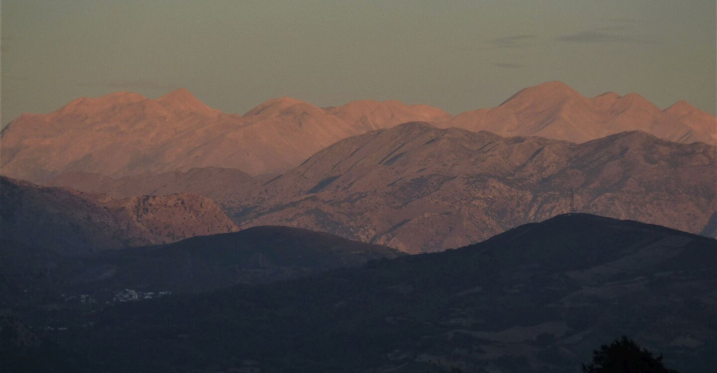 Von 01 Spili (414 m) wandern wir auf der ortsauswärts führenden Hauptstraße vorbei an der Schule und Richtung Plakias. Bei guter Sicht gibt es schon mal einen Vorgeschmack auf die nachfolgenden Tage, in der Ferne sieht man am Horizont, wie sich die weißen Berge aus dem Dunst erheben. Nach 3 km erreichen wir die Ortschaft Mixorrouma.
