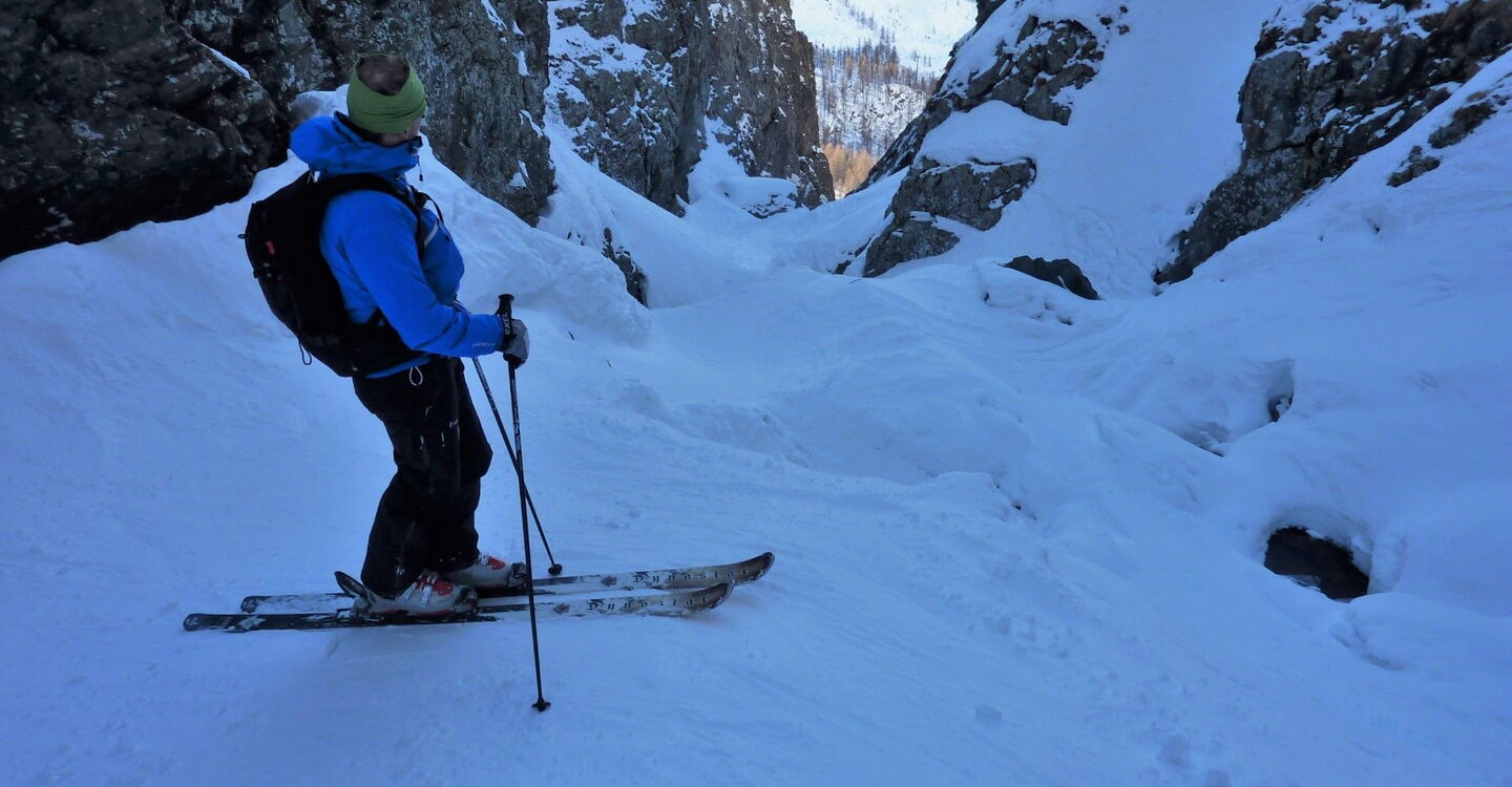 Der Einstieg in die Scharte und auch in den Canyon erfordert eine gute Orientierung, am besten mithilfe des GPS-Tracks. Die Abfahrt führt über einen Westhang. Folgende Ausrüstung wird empfohlen: Produkte für alpine Sicherheit im Schnee, Freerideski und Skitourenhelm. Es gibt verschiedene Restaurants zur Einkehr im Skigebiet. Beste Jahreszeit: Januar bis April. Uns erwarten kurze Stücke mit bis zu 40° Hangneigung.