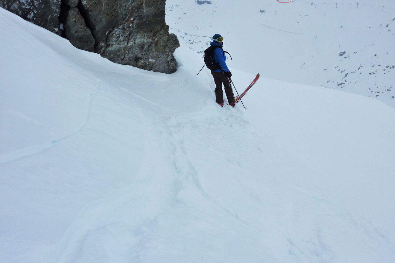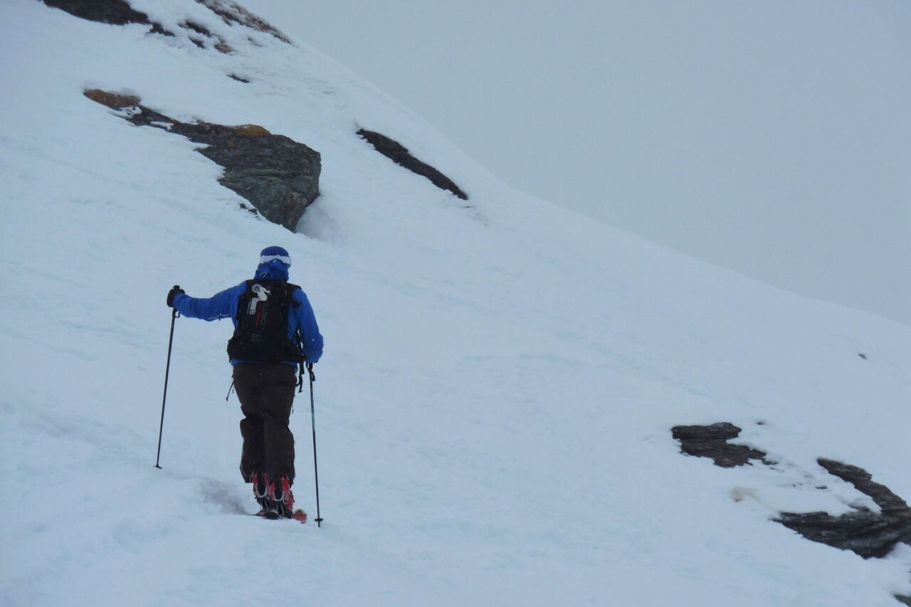 Einfache Abfahrt über den Gletscher. Bitte unbedingt die Absturzwarnung hinter dem Canyon beachten. Die Abfahrt führt über einen Westhang. Folgende Ausrüstung wird empfohlen: Produkte für alpine Sicherheit im Schnee, Tourenski und Skitourenhelm. Es gibt keine Einkehr auf der Tour. Außer man nimmt vor oder nach der Tour eine Stärkung in dem Rifugio Città di Vigevano. Beste Jahreszeit: Januar bis April. Uns erwarten kurze Stücke mit bis zu 30° Hangneigung.