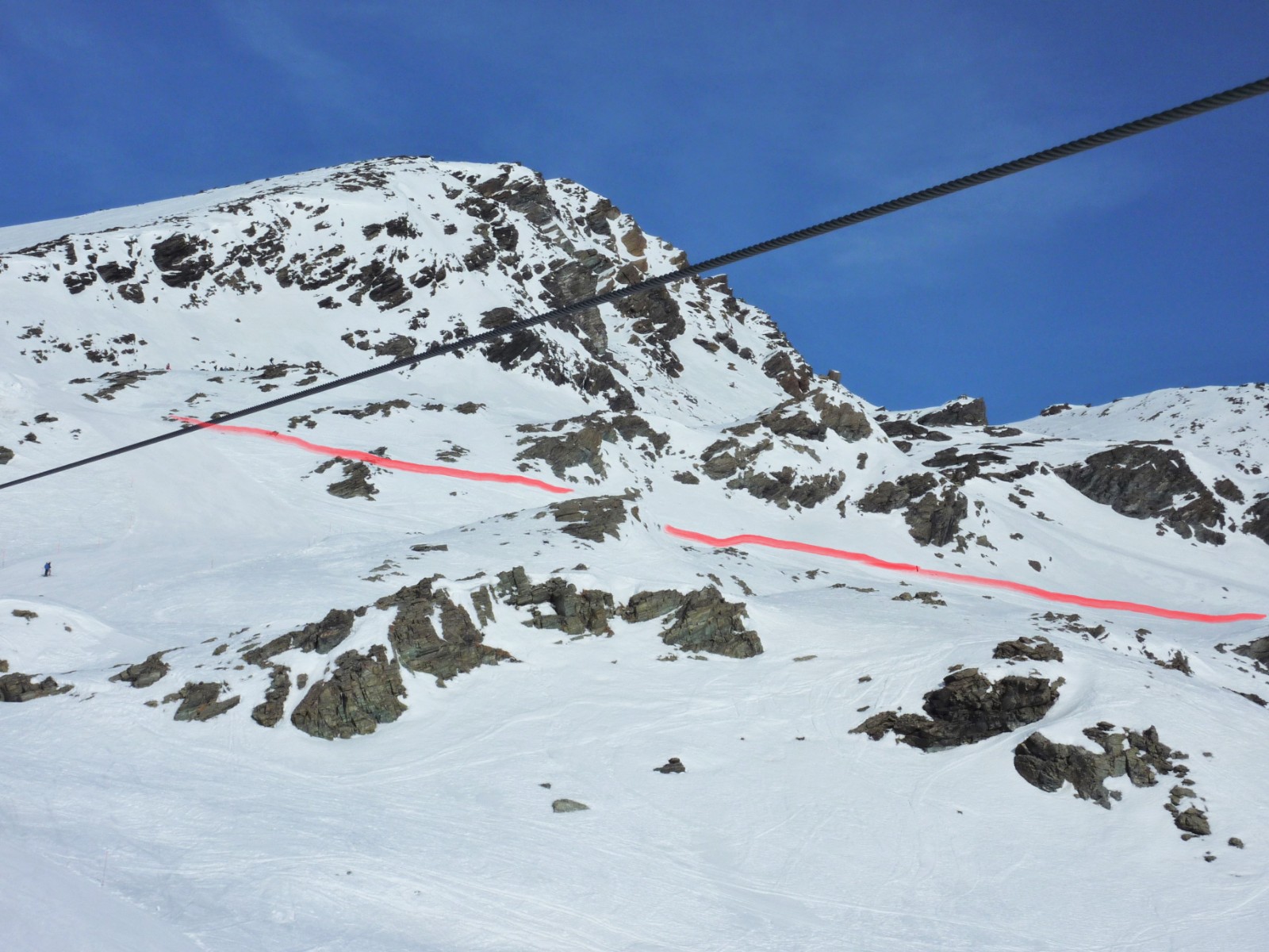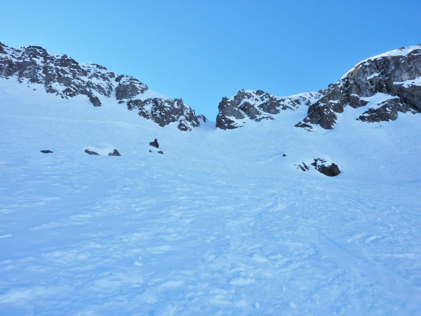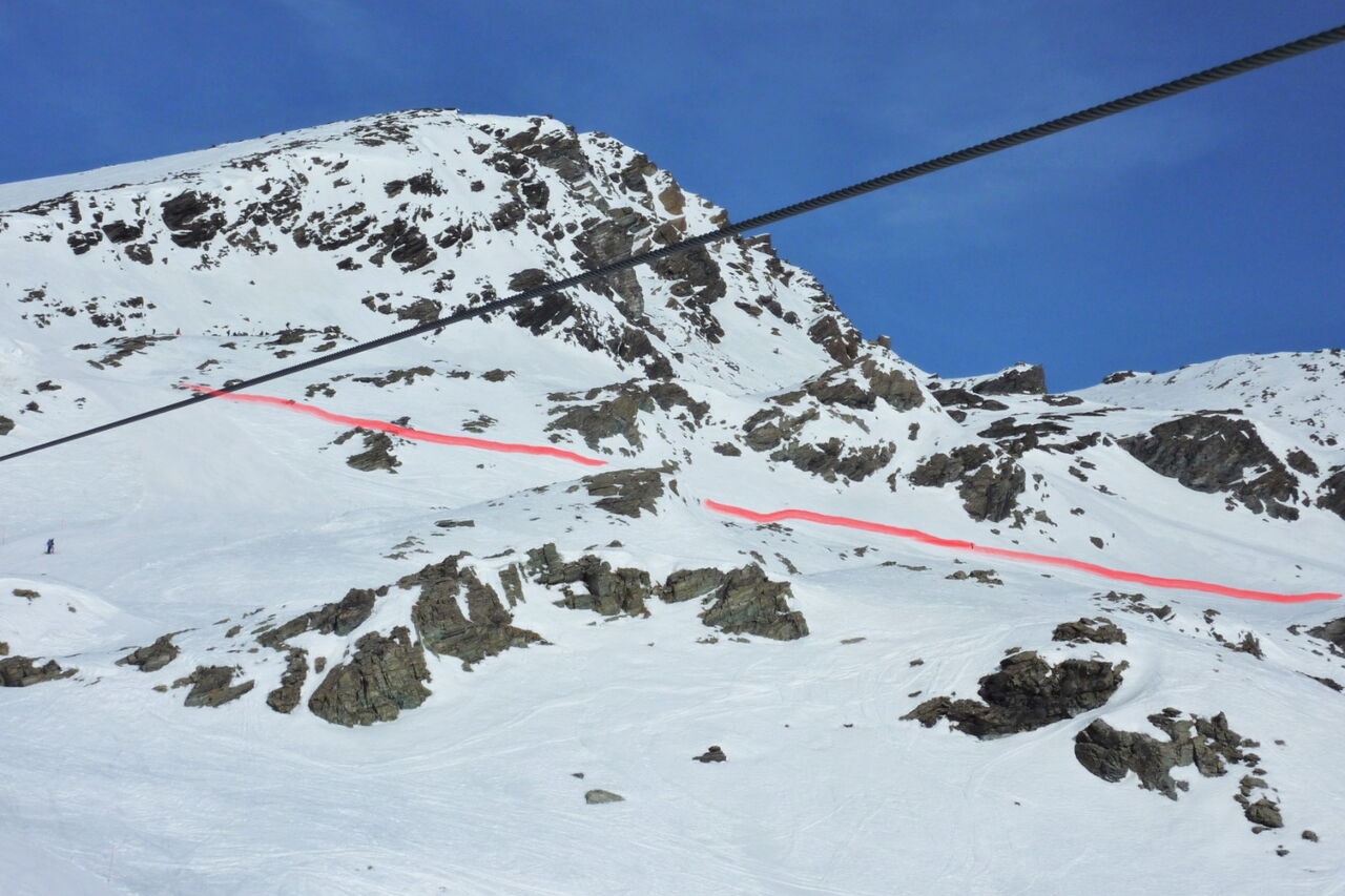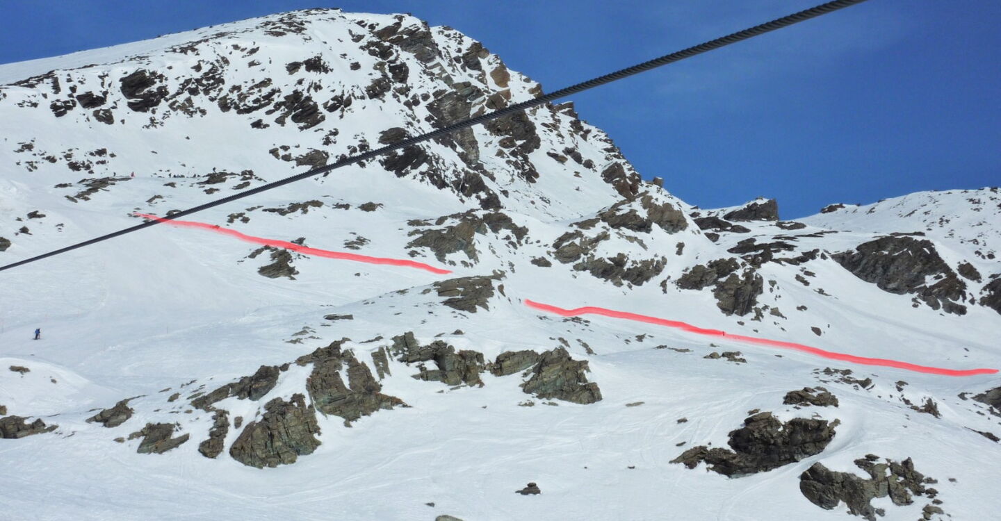Je nach Schneeverhältnissen sehen wir einen Felsen, an dem wir links vorbeifahren, um nach 900 m hinter dem Lift zur Einfahrt in die Scharte zu kommen. Die Scharte ist 10 bis 15 m breit.
