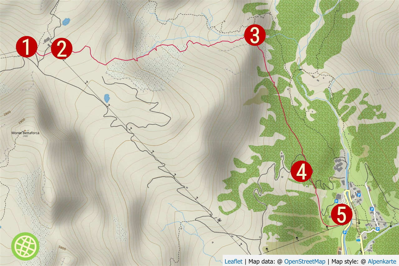 Wir beginnen die Tour bei der Bergstation des Sessellifts Nr. 17 Sant`Anna-Colle Betta. Hier fahren wir nur 50 m bergab Richtung Staffal, um die Piste dann nach links zu verlassen.
