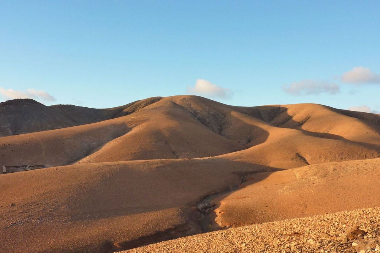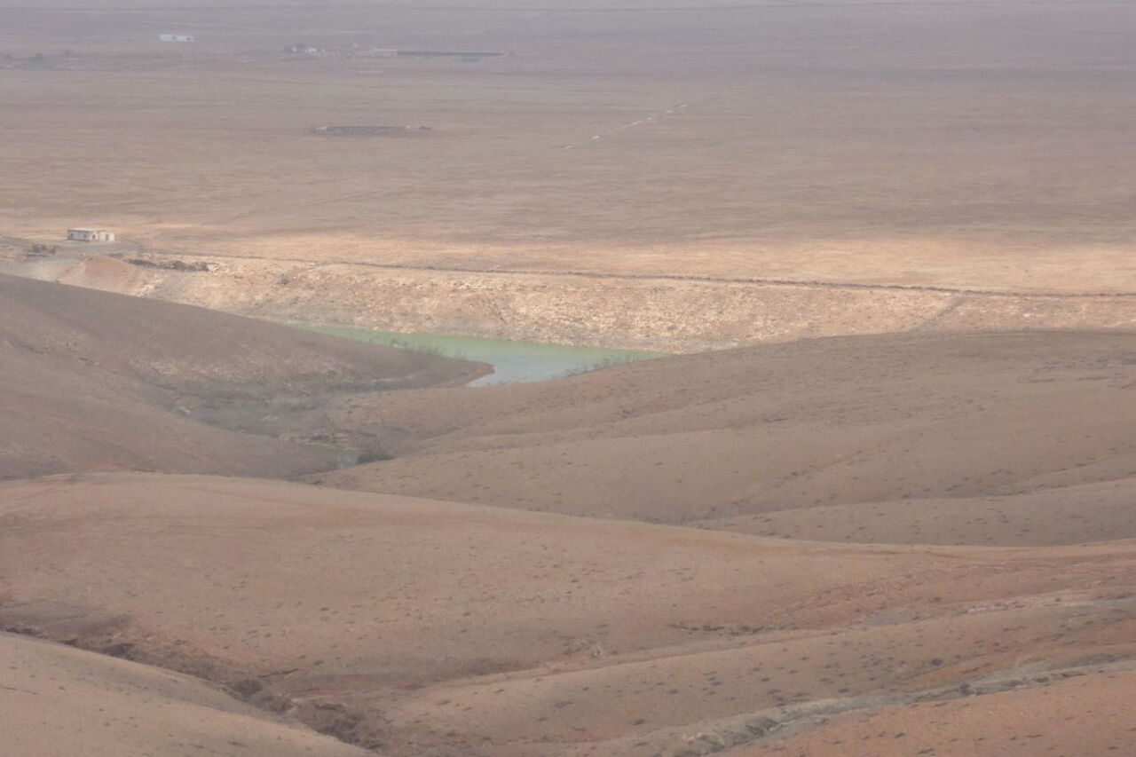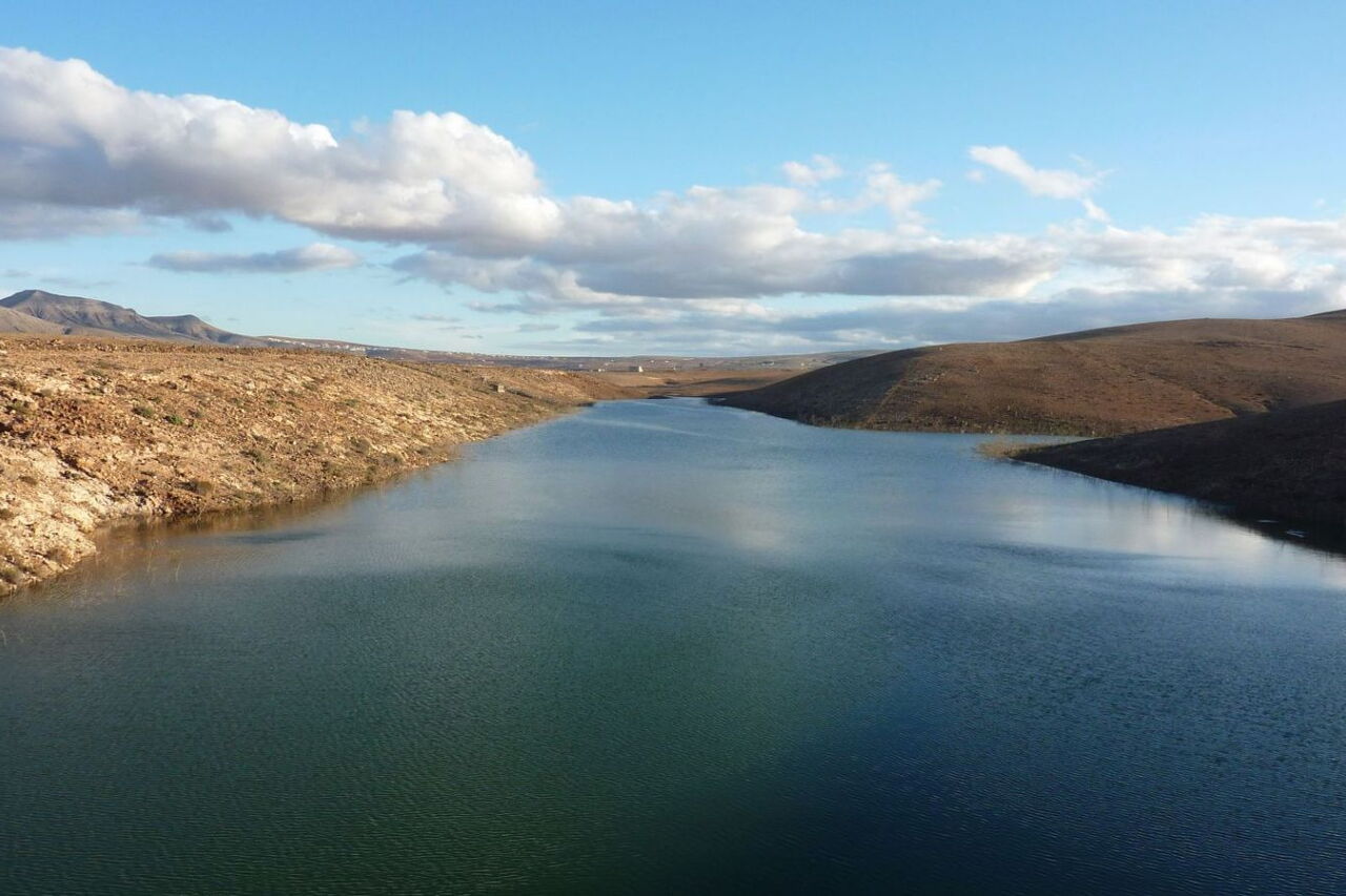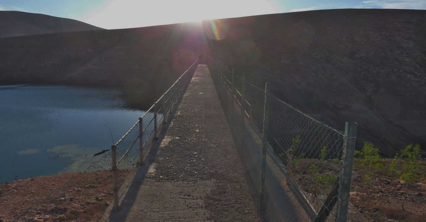 Die andauernde Wasserknappheit war schon immer eines der größten Probleme auf Fuerteventura. Überall auf der Insel sieht man deshalb kleine Staustufen. Diese Wanderung führt um den einzigen nicht verlandeten Stausee auf Fuerteventura. Im ersten Teil steigt der Weg durch die seichten, bei Abendlicht ockergelb erscheinenden Hügelketten an, um dann nach dem höchsten Punkt der Wanderung gemächlich zum Stausee abzufallen. Wir gehen anschließend 600 Meter parallel zum Stausee, bis wir ihn bei seinem südlichsten Zulauf überqueren. Es folgt ein Wegstück durch ein extrem karges Landschaftsbild, bis wir durch eine bewirtschaftete Region wandern und wieder am Ausgangspunkt ankommen.