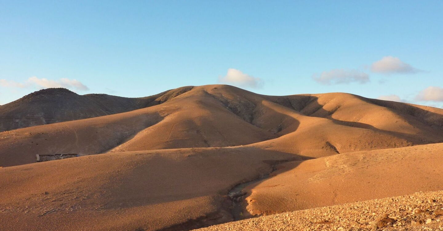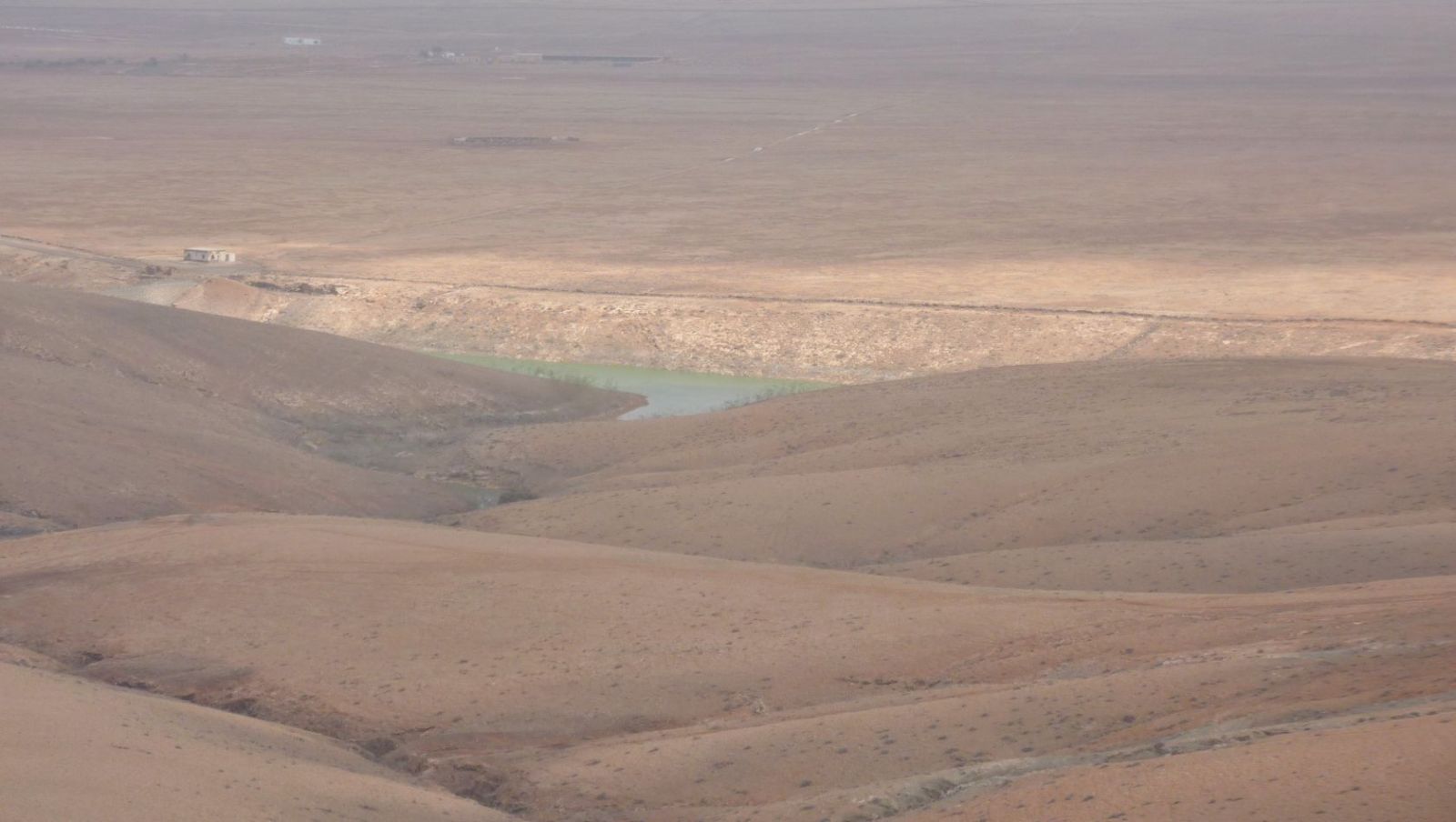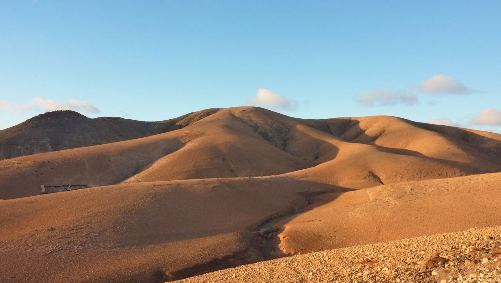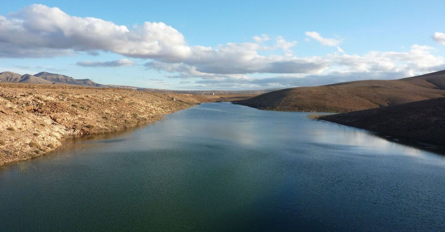 Die andauernde Wasserknappheit war schon immer eines der größten Probleme auf Fuerteventura. Überall auf der Insel sieht man deshalb kleine Staustufen. Diese Wanderung führt um den einzigen nicht verlandeten Stausee auf Fuerteventura. Im ersten Teil steigt der Weg durch die seichten, bei Abendlicht ockergelb erscheinenden Hügelketten an, um dann nach dem höchsten Punkt der Wanderung gemächlich zum Stausee abzufallen. Wir gehen anschließend 600 Meter parallel zum Stausee, bis wir ihn bei seinem südlichsten Zulauf überqueren. Es folgt ein Wegstück durch ein extrem karges Landschaftsbild, bis wir durch eine bewirtschaftete Region wandern und wieder am Ausgangspunkt ankommen.