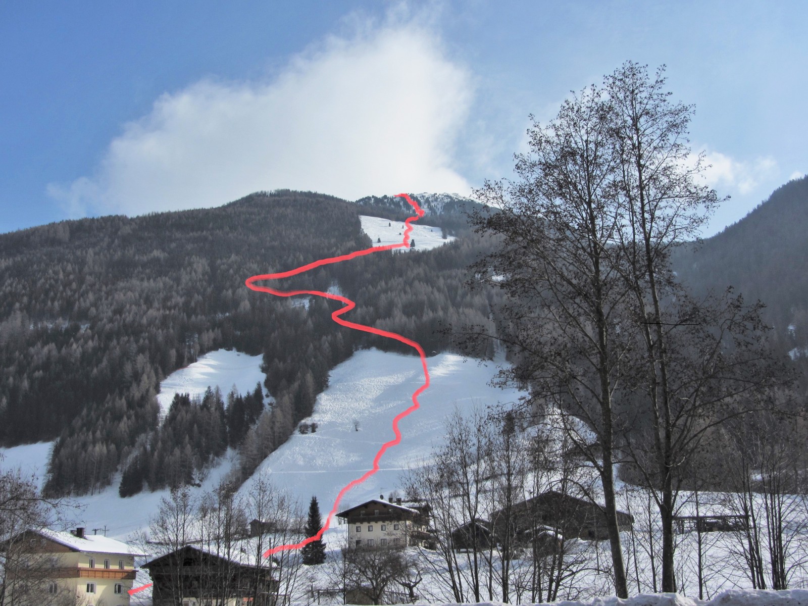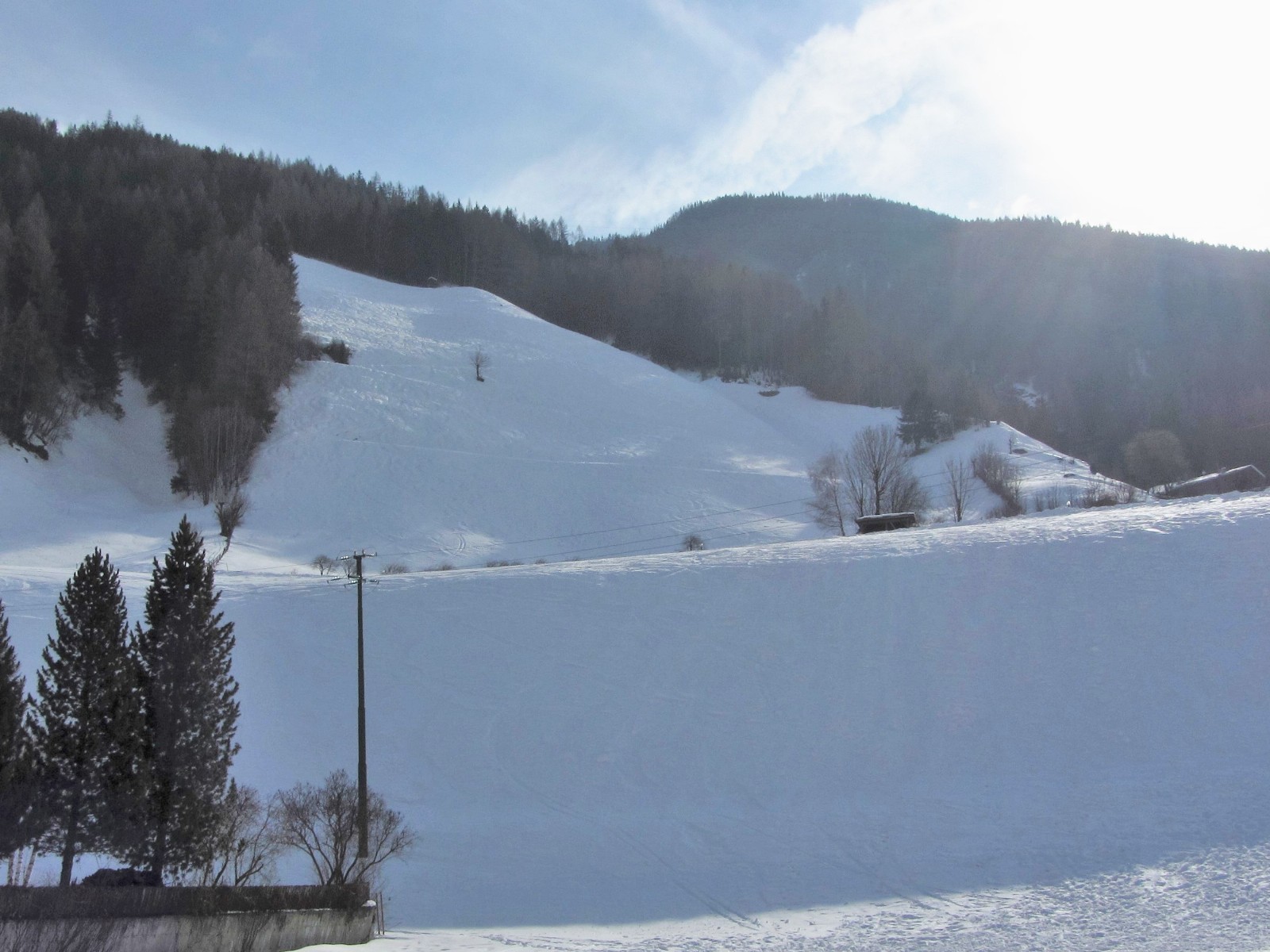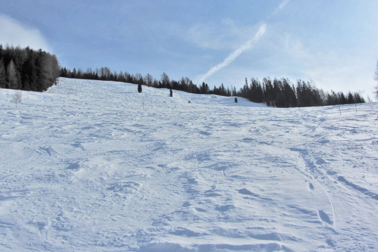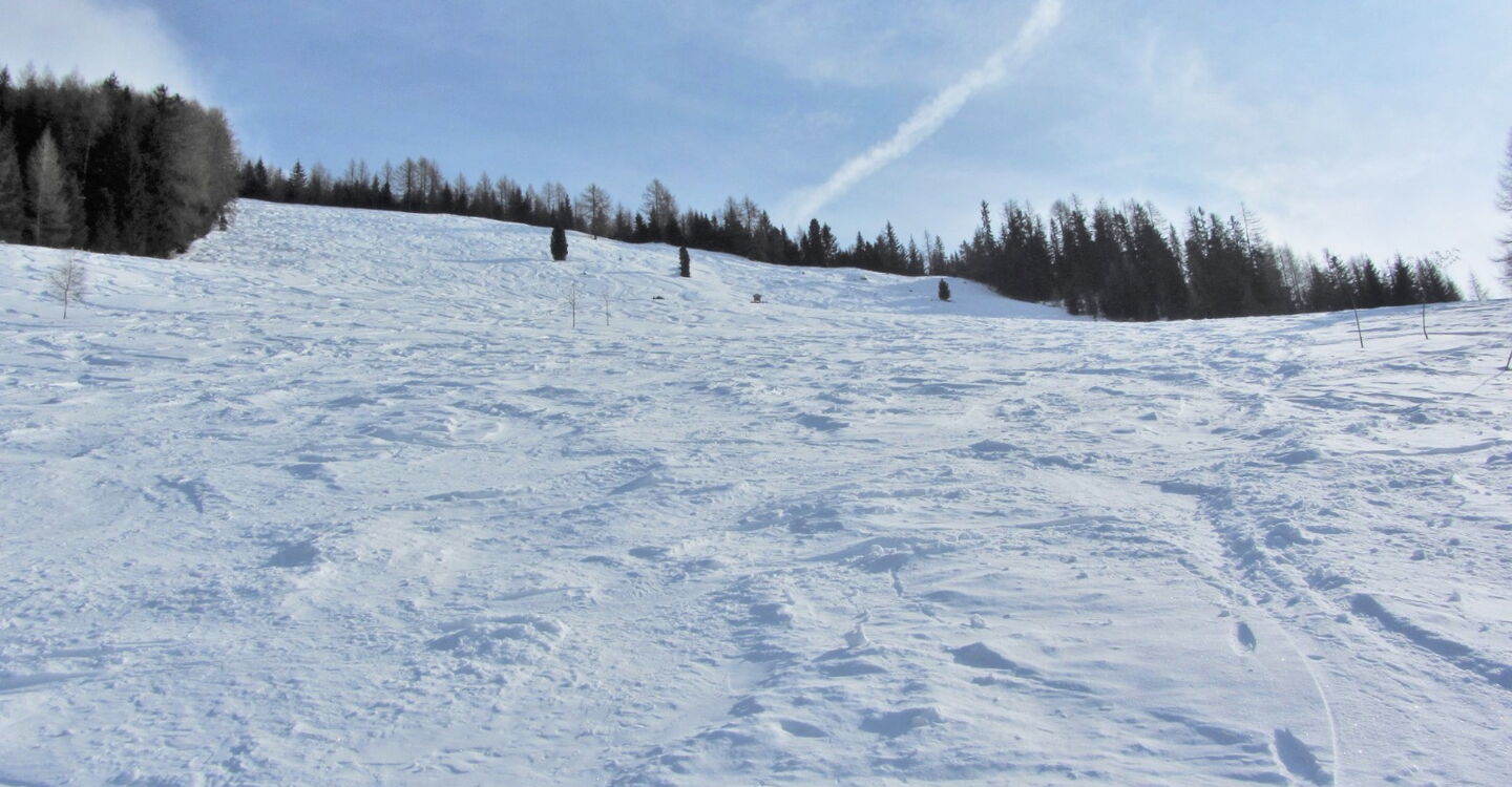 An der Bergstation des Sessellifts Hühnerspiel fellen wir auf, gehen links vom Lift Richtung Süden und steigen auf dem Grat, auf dem uns immer wieder lichte Waldstellen begegnen, ca. 200 hm auf den Bachberg.